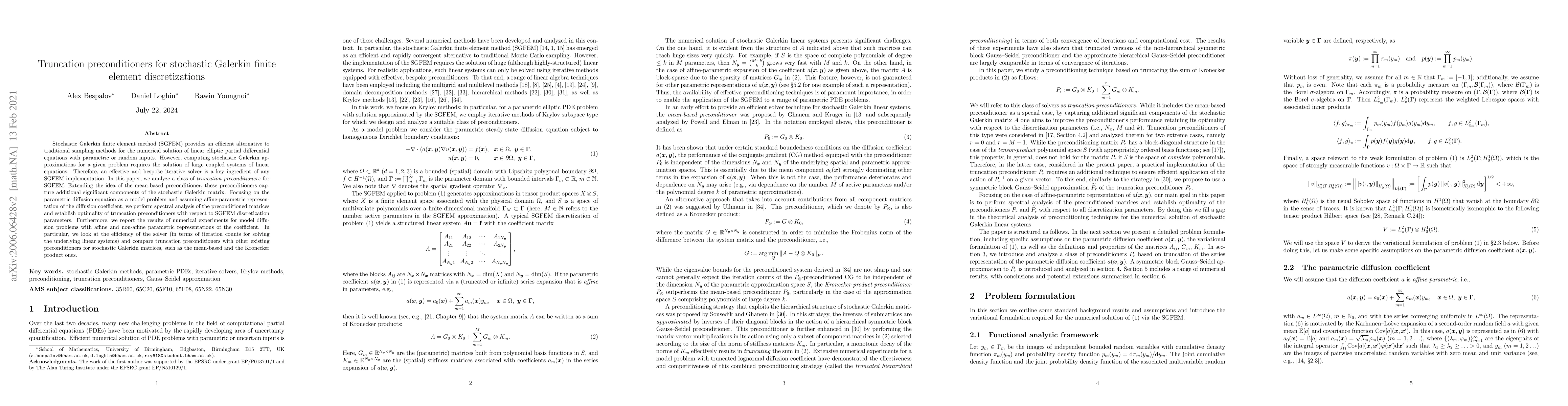 This paper analyzes truncation preconditioners for Stochastic Galerkin finite element methods (SGFEM) to solve linear elliptic PDEs with random inputs, focusing on the parametric diffusion equation. The proposed preconditioners outperform existing methods in terms of solver efficiency, as demonstrated through spectral analysis and numerical experiments.