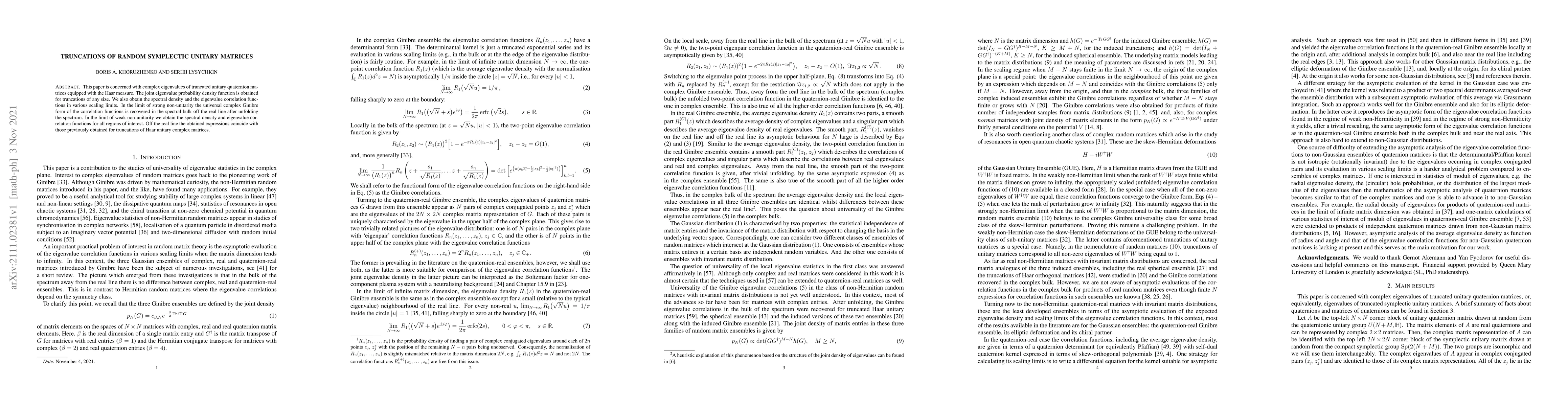This paper investigates the complex eigenvalues of truncated random symplectic unitary quaternion matrices, deriving their joint eigenvalue probability density, spectral density, and eigenvalue correlation functions. It recovers the universal Ginibre form in strong non-unitarity limits and matches previously obtained results for complex matrices in weak non-unitarity limits.