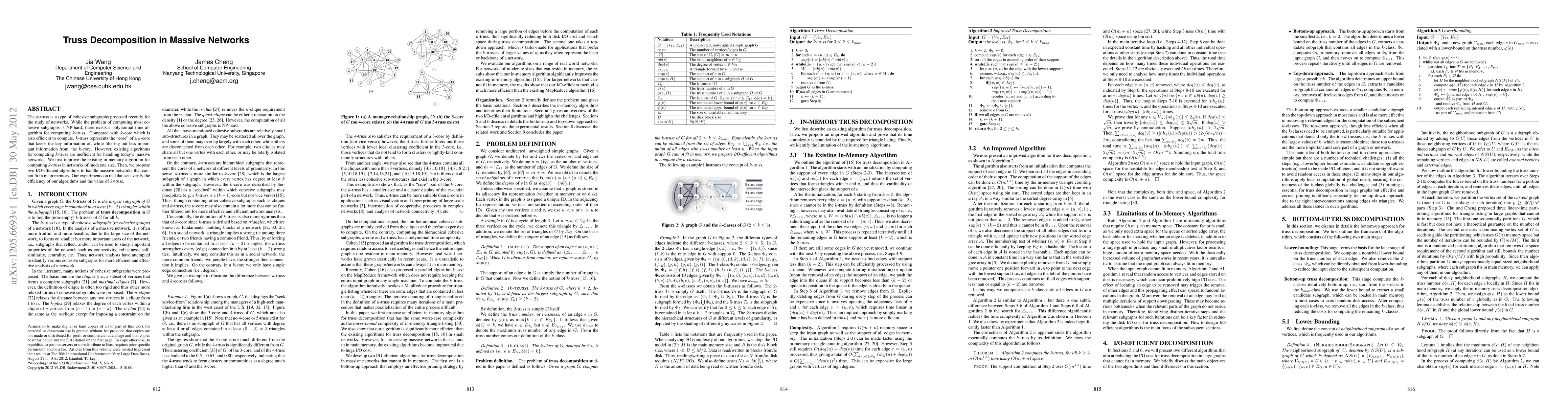 The k-truss is a type of cohesive subgraphs proposed recently for the study of networks. While the problem of computing most cohesive subgraphs is NP-hard, there exists a polynomial time algorithm for computing k-truss. Compared with k-core which is also efficient to compute, k-truss represents the "core" of a k-core that keeps the key information of, while filtering out less important information from, the k-core. However, existing algorithms for computing k-truss are inefficient for handling today's massive networks. We first improve the existing in-memory algorithm for computing k-truss in networks of moderate size. Then, we propose two I/O-efficient algorithms to handle massive networks that cannot fit in main memory. Our experiments on real datasets verify the efficiency of our algorithms and the value of k-truss.