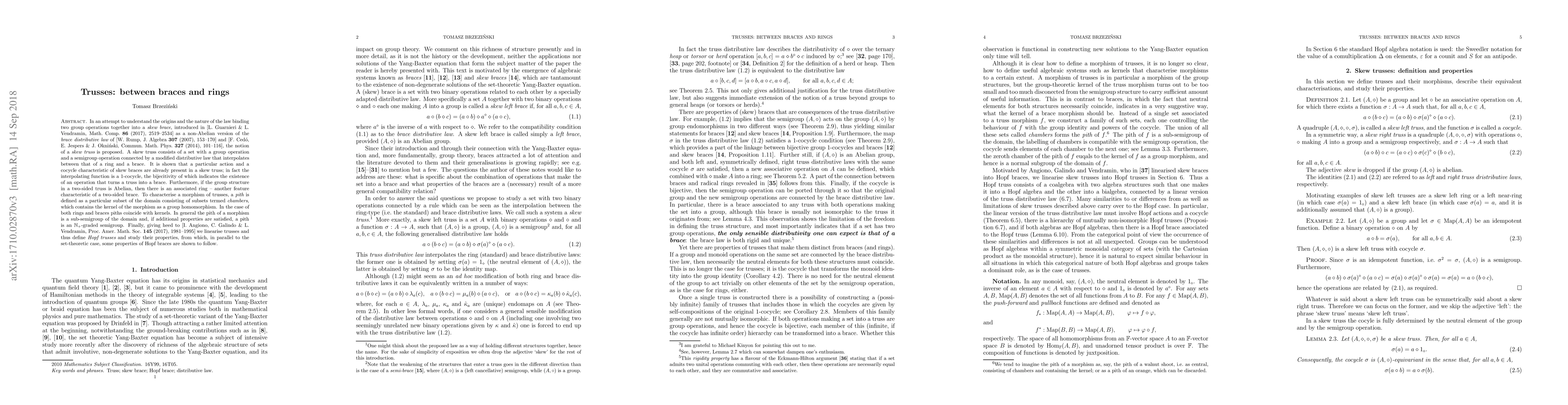 In an attempt to understand the origins and the nature of the law binding together two group operations into a {\em skew brace}, introduced in [L.\ Guarnieri \& L.\ Vendramin, Math.\ Comp.\ \textbf{86} (2017), 2519--2534] as a non-Abelian version of the {\em brace distributive law} of [W.\ Rump, J.\ Algebra {\bf 307} (2007), 153--170] and [F.\ Ced\'o, E.\ Jespers \& J.\ Okni\'nski, Commun.\ Math.\ Phys.\ {\bf 327} (2014), 101--116], the notion of a {\em skew truss} is proposed. A skew truss consists of a set with a group operation and a semigroup operation connected by a modified distributive law that interpolates between that of a ring and a brace. It is shown that a particular action and a cocycle characteristic of skew braces are already present in a skew truss; in fact the interpolating function is a 1-cocycle, the bijecitivity of which indicates the existence of an operation that turns a truss into a brace. Furthermore, if the group structure in a two-sided truss is Abelian, then there is an associated ring -- another feature characteristic of a two-sided brace. To characterise a morphism of trusses, a {\em pith} is defined as a particular subset of the domain consisting of subsets termed {\em chambers}, which contains the kernel of the morphism as a group homomorphism. In the case of both rings and braces piths coincide with kernels. In general the pith of a morphism is a sub-semigroup of the domain and, if additional properties are satisfied, a pith is a $\mathbb{N}_+$-graded semigroup. Finally, giving heed to [I.\ Angiono, C.\ Galindo \& L.\ Vendramin, Proc.\ Amer.\ Math.\ Soc.\ {\bf 145} (2017), 1981--1995] we linearise trusses and thus define {\em Hopf trusses} and study their properties, from which, in parallel to the set-theoretic case, some properties of Hopf braces are shown to follow.