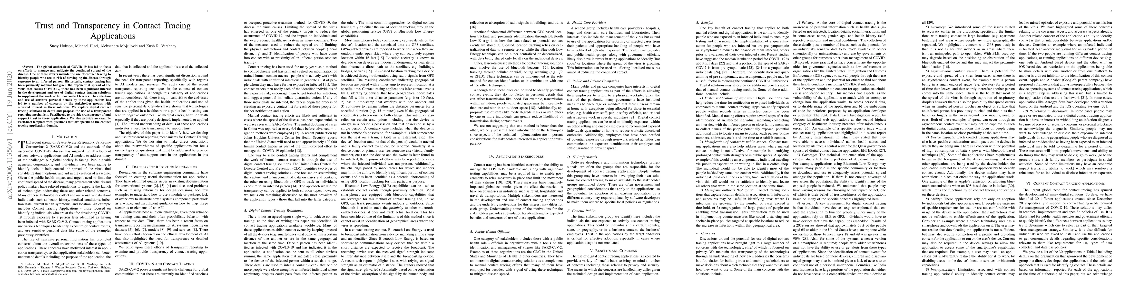 The paper proposes using transparent reporting mechanisms, like FactSheets, to build trust in digital contact tracing applications, addressing concerns over personal data collection.