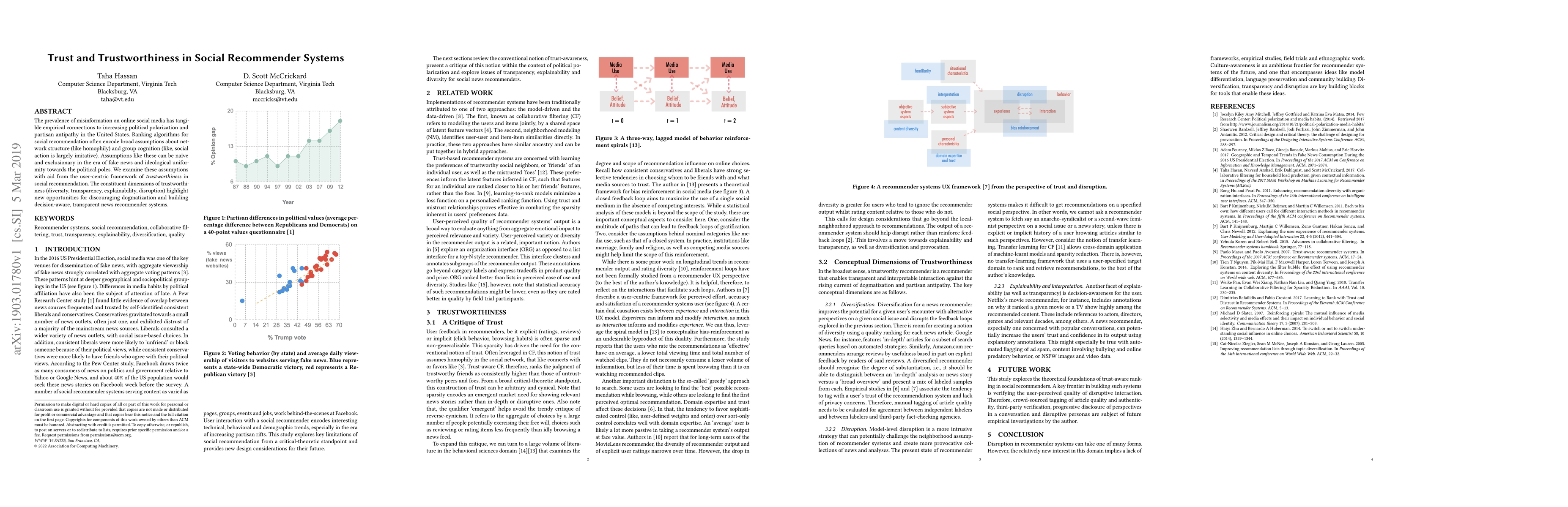 This paper investigates how trust and trustworthiness in social recommender systems can mitigate misinformation and political polarization. It proposes that enhancing dimensions like diversity, transparency, explainability, and disruption in recommendation algorithms can foster more balanced and informed user interactions.