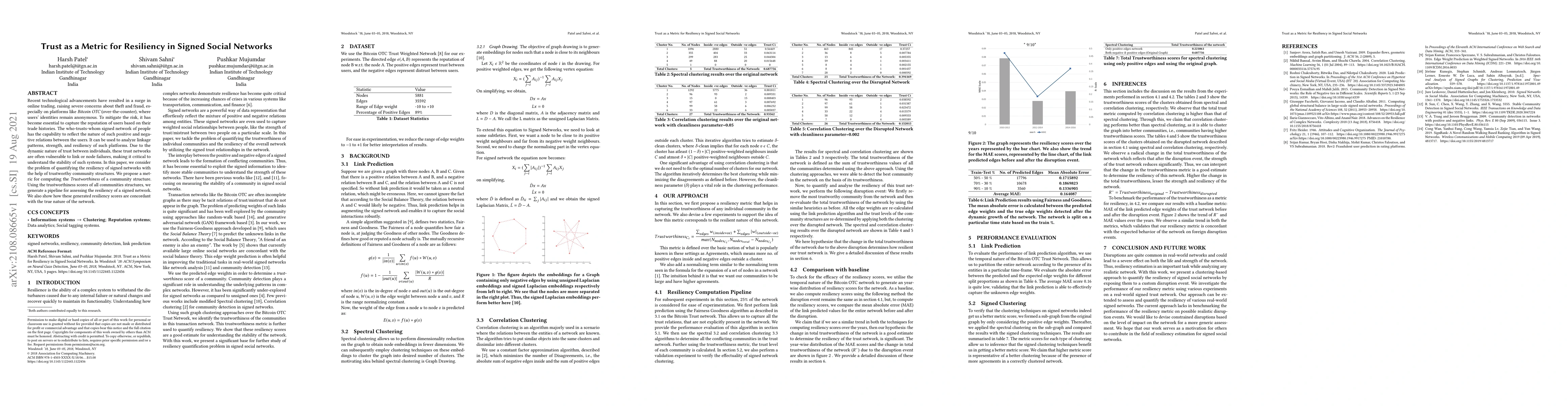 This paper proposes a metric to quantify the resiliency of signed social networks, particularly in online trading platforms like Bitcoin OTC, by analyzing the trustworthiness of community structures within the trust networks. The authors demonstrate the effectiveness of their resiliency assessment pipeline through its alignment with the actual stability of the networks.