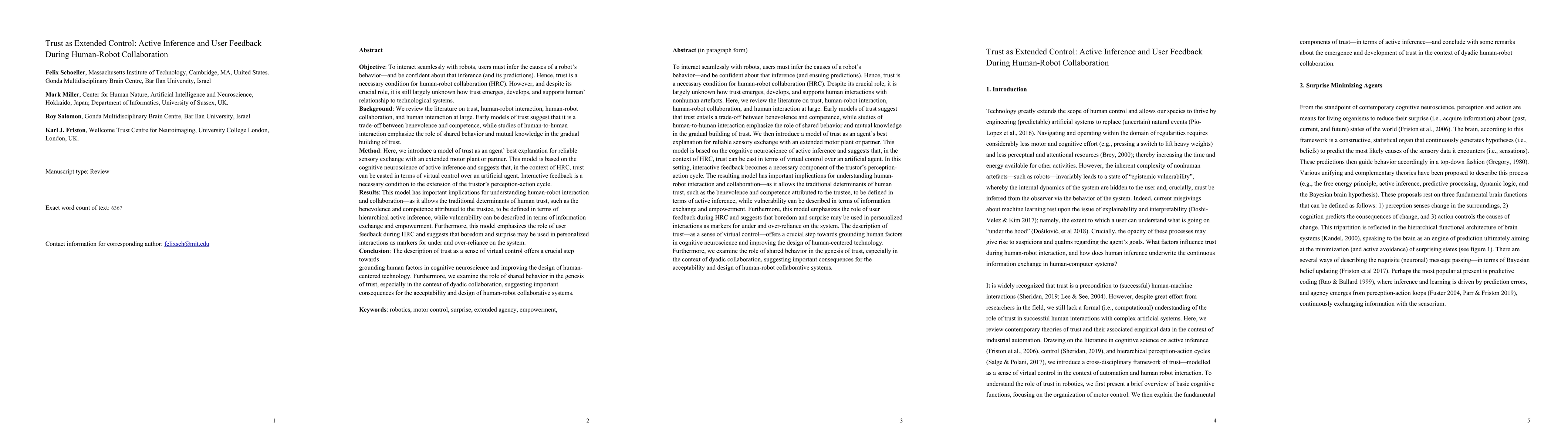This paper explores trust as an agent's best explanation for reliable sensory exchange with a robot, framing it in terms of extended control through active inference. It highlights the importance of user feedback in human-robot collaboration, suggesting that trust emerges from shared behavior and mutual knowledge, and proposes that boredom and surprise can indicate under or over-reliance on the robot.