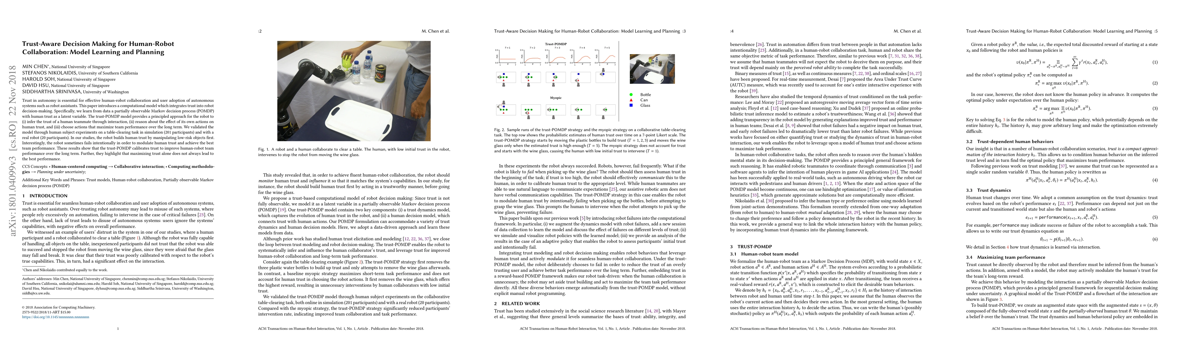 This paper proposes a trust-aware decision-making model for human-robot collaboration, integrating trust into a POMDP framework to infer human trust, reason about its impact on trust, and optimize actions for long-term team performance. Experiments show the robot can build trust by manipulating low-risk objects and sometimes intentionally failing to modulate trust, demonstrating that maximizing trust alone does not always yield optimal performance.