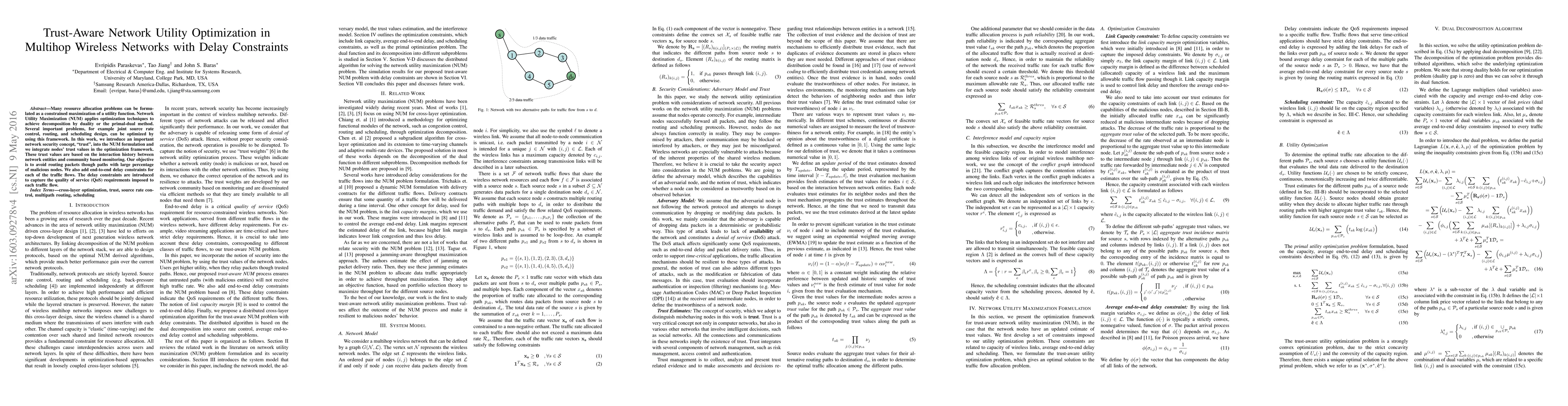 Many resource allocation problems can be formulated as a constrained maximization of a utility function. Network Utility Maximization (NUM) applies optimization techniques to achieve decomposition by duality or the primal-dual method. Several important problems, for example joint source rate control, routing, and scheduling design, can be optimized by using this framework. In this work, we introduce an important network security concept, "trust", into the NUM formulation and we integrate nodes' trust values in the optimization framework. These trust values are based on the interaction history between network entities and community based monitoring. Our objective is to avoid routing packets though paths with large percentage of malicious nodes. We also add end-to-end delay constraints for each of the traffic flows. The delay constraints are introduced to capture the quality of service (QoS) requirements imposed to each traffic flow.