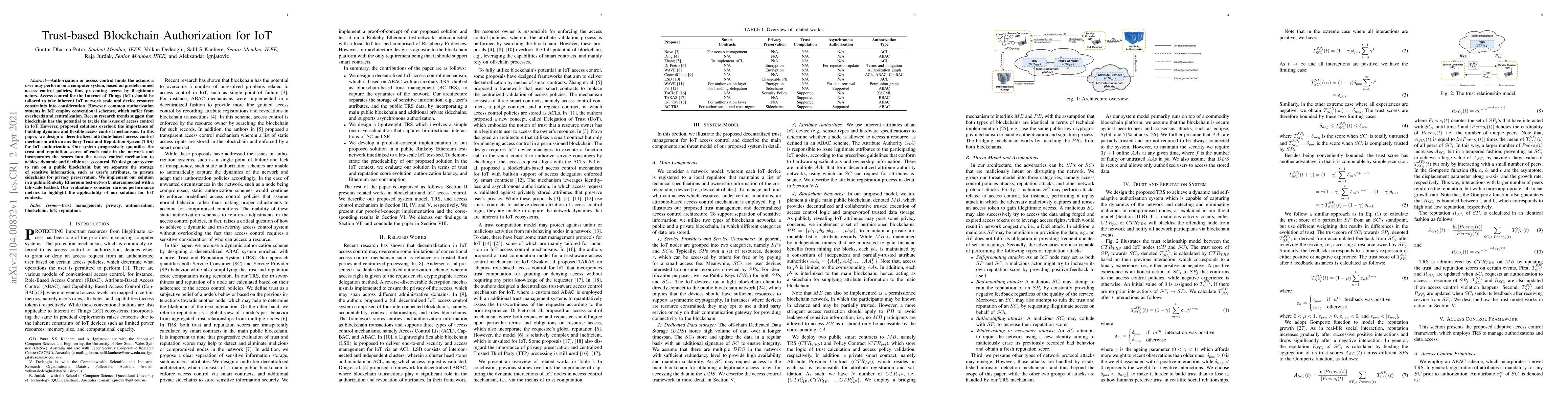 This paper proposes a decentralized, attribute-based access control mechanism for IoT using blockchain, integrating a Trust and Reputation System (TRS) to dynamically adjust access permissions based on node trustworthiness. The system runs on a public blockchain while sensitive data is stored on private sidechains to maintain privacy.