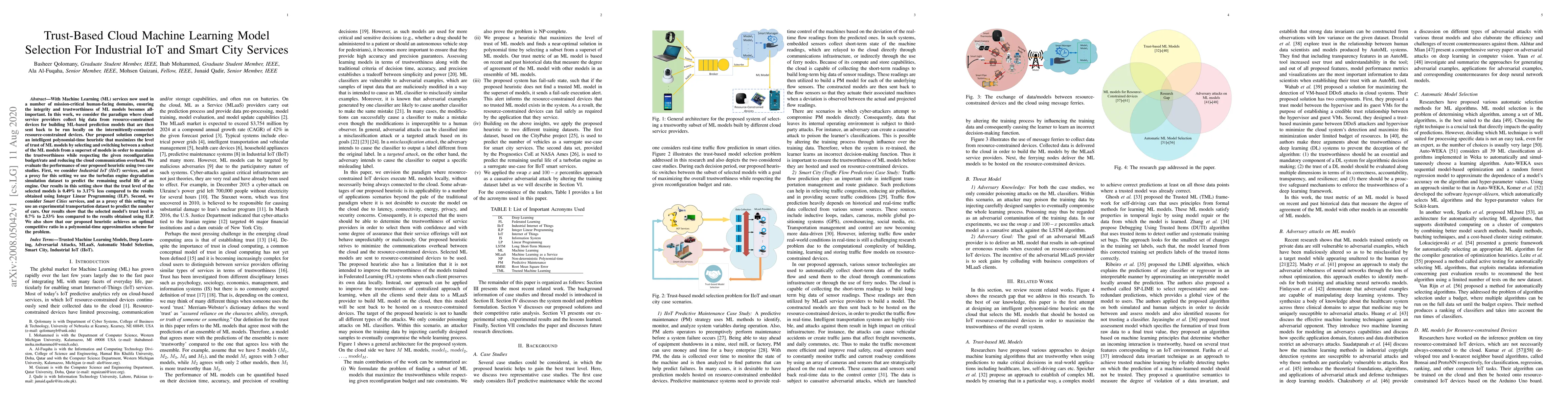 With Machine Learning (ML) services now used in a number of mission-critical human-facing domains, ensuring the integrity and trustworthiness of ML models becomes all-important. In this work, we consider the paradigm where cloud service providers collect big data from resource-constrained devices for building ML-based prediction models that are then sent back to be run locally on the intermittently-connected resource-constrained devices. Our proposed solution comprises an intelligent polynomial-time heuristic that maximizes the level of trust of ML models by selecting and switching between a subset of the ML models from a superset of models in order to maximize the trustworthiness while respecting the given reconfiguration budget/rate and reducing the cloud communication overhead. We evaluate the performance of our proposed heuristic using two case studies. First, we consider Industrial IoT (IIoT) services, and as a proxy for this setting, we use the turbofan engine degradation simulation dataset to predict the remaining useful life of an engine. Our results in this setting show that the trust level of the selected models is 0.49% to 3.17% less compared to the results obtained using Integer Linear Programming (ILP). Second, we consider Smart Cities services, and as a proxy of this setting, we use an experimental transportation dataset to predict the number of cars. Our results show that the selected model's trust level is 0.7% to 2.53% less compared to the results obtained using ILP. We also show that our proposed heuristic achieves an optimal competitive ratio in a polynomial-time approximation scheme for the problem.