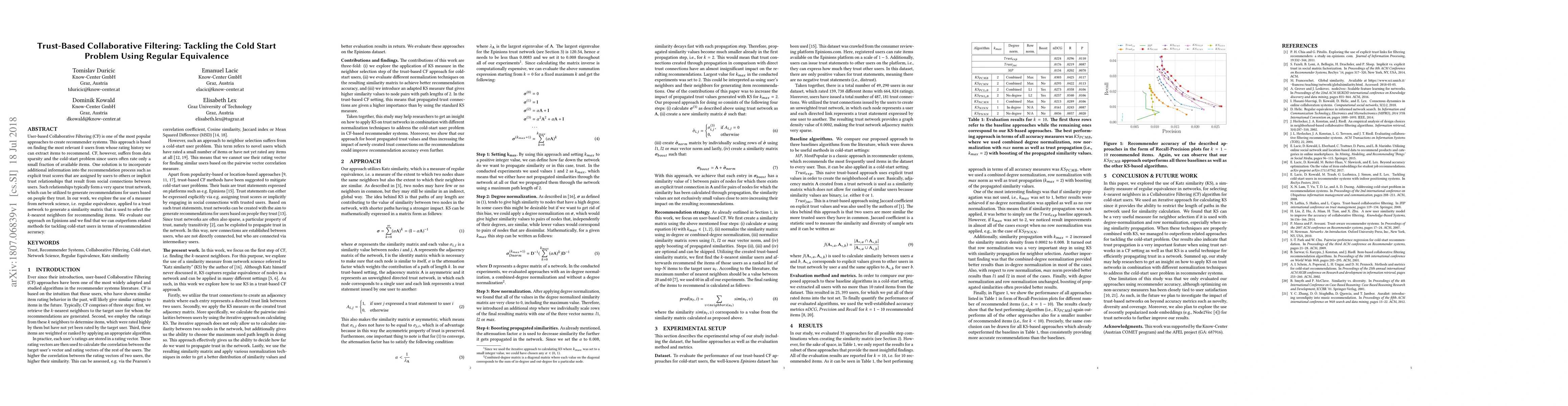 This paper proposes using regular equivalence in trust networks to tackle the cold-start problem in collaborative filtering recommender systems. The method outperforms related approaches by generating a similarity matrix to recommend items based on trusted users, evaluated on the Epinions dataset.