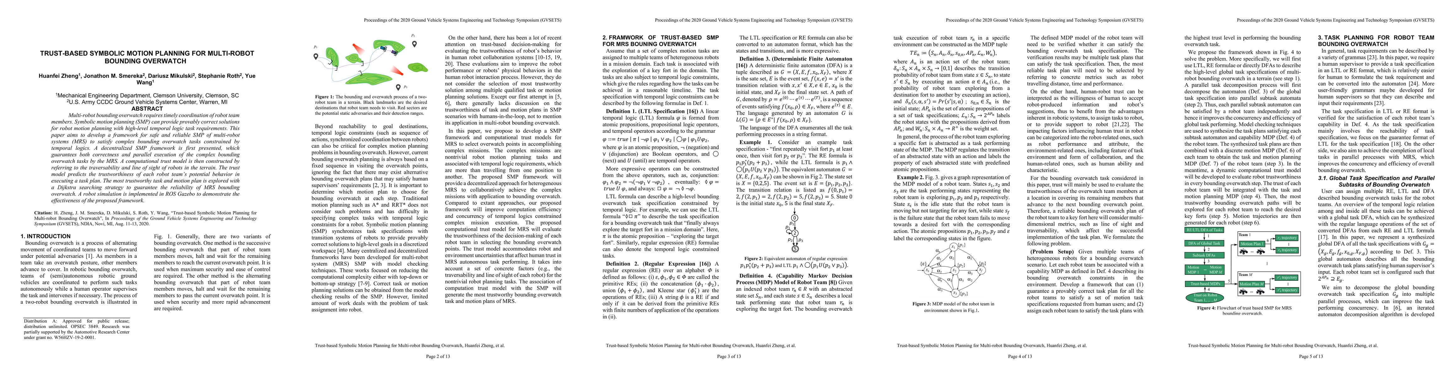This paper develops a decentralized symbolic motion planning framework for multi-robot systems to execute complex bounding overwatch tasks, incorporating a computational trust model based on terrain traversability and line of sight to ensure the most reliable task execution. The framework is validated through a simulation in ROS Gazebo.