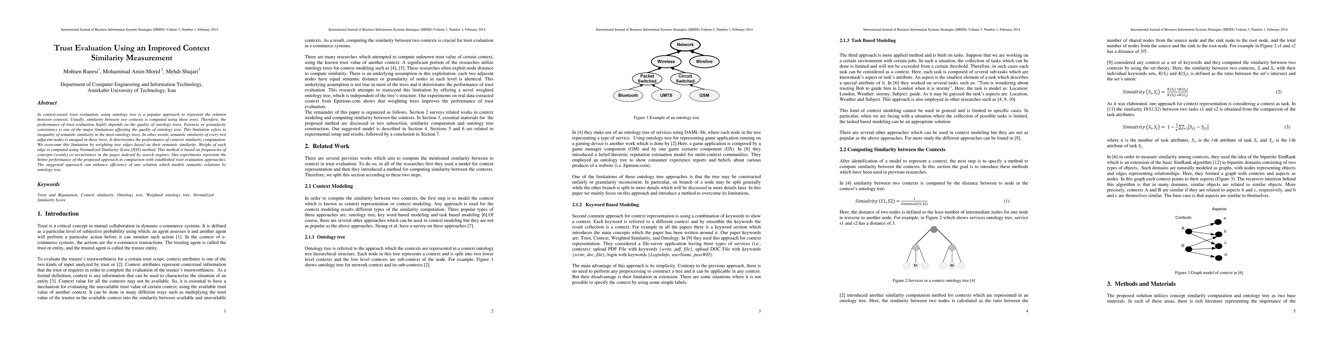 This paper proposes an improved method for context similarity measurement in trust evaluation by weighting ontology tree edges based on their semantic similarity, using a Normalized Similarity Score (NSS) method. The approach aims to address the issue of granularity inconsistency in ontology trees, leading to improved performance in context similarity computation.