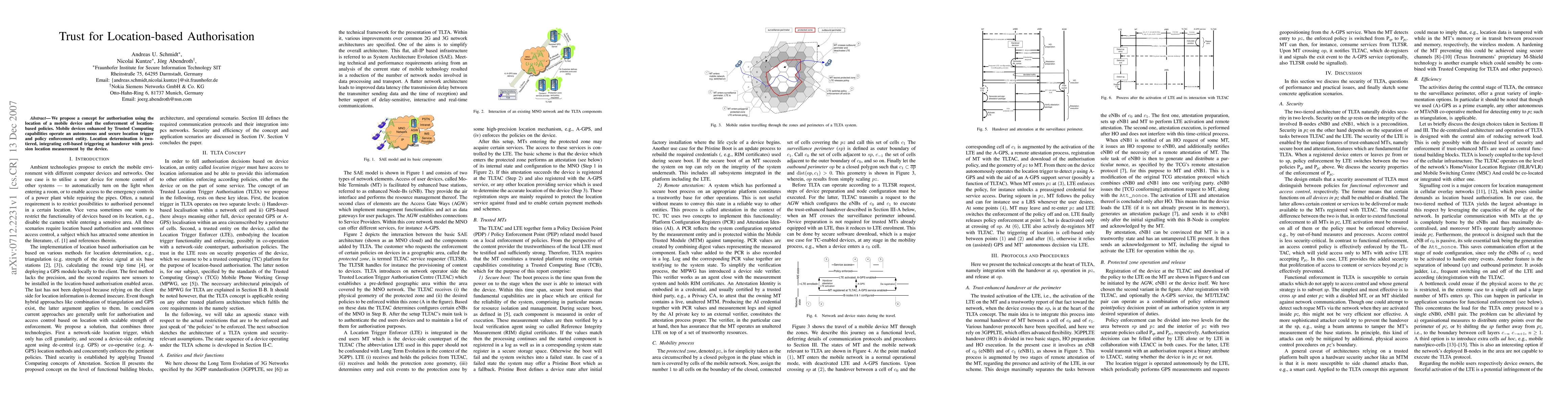 We propose a concept for authorisation using the location of a mobile device and the enforcement of location-based policies. Mobile devices enhanced by Trusted Computing capabilities operate an autonomous and secure location trigger and policy enforcement entity. Location determination is two-tiered, integrating cell-based triggering at handover with precision location measurement by the device.