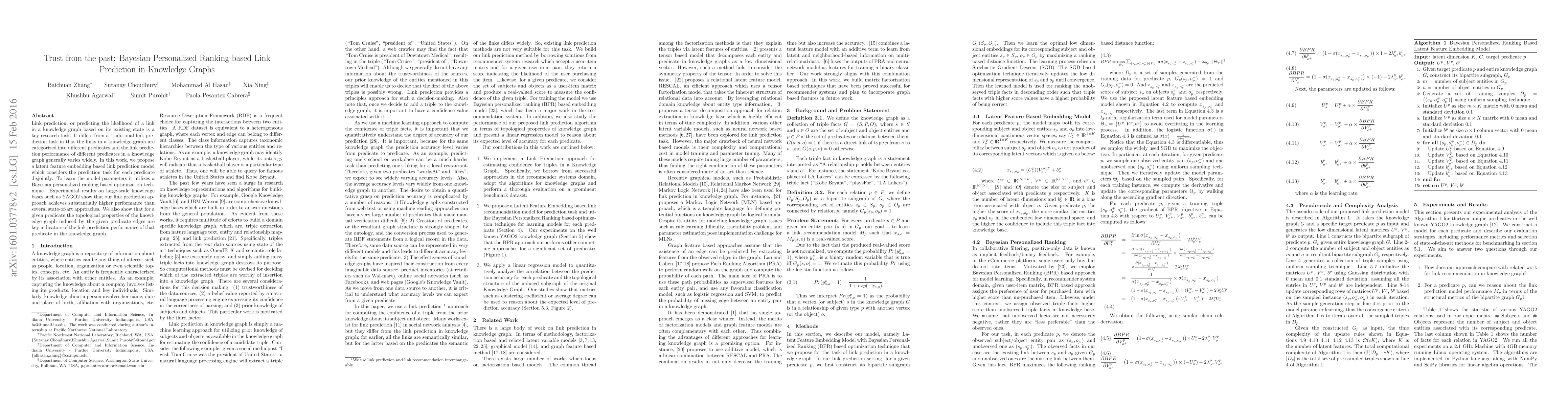 Link prediction, or predicting the likelihood of a link in a knowledge graph based on its existing state is a key research task. It differs from a traditional link prediction task in that the links in a knowledge graph are categorized into different predicates and the link prediction performance of different predicates in a knowledge graph generally varies widely. In this work, we propose a latent feature embedding based link prediction model which considers the prediction task for each predicate disjointly. To learn the model parameters it utilizes a Bayesian personalized ranking based optimization technique. Experimental results on large-scale knowledge bases such as YAGO2 show that our link prediction approach achieves substantially higher performance than several state-of-art approaches. We also show that for a given predicate the topological properties of the knowledge graph induced by the given predicate edges are key indicators of the link prediction performance of that predicate in the knowledge graph.