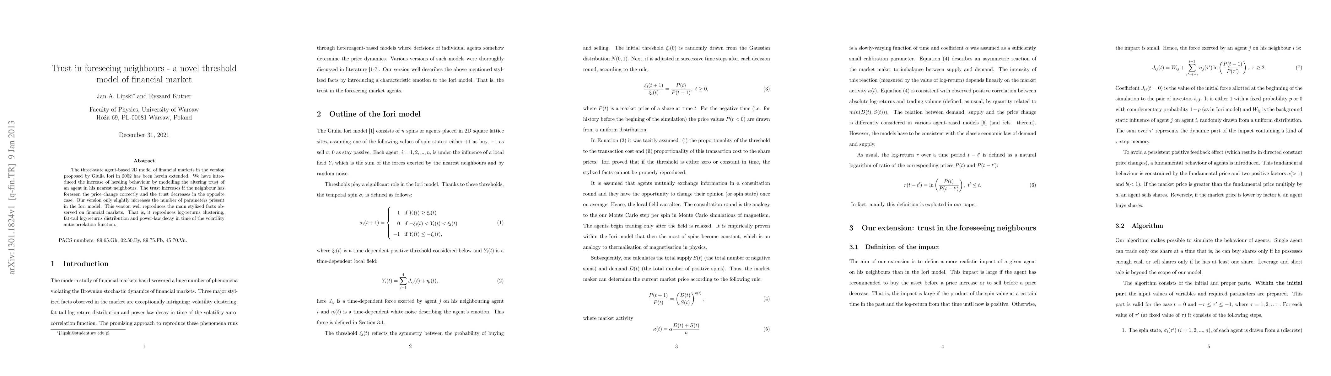 The three-state agent-based 2D model of financial markets in the version proposed by Giulia Iori in 2002 has been herein extended. We have introduced the increase of herding behaviour by modelling the altering trust of an agent in his nearest neighbours. The trust increases if the neighbour has foreseen the price change correctly and the trust decreases in the opposite case. Our version only slightly increases the number of parameters present in the Iori model. This version well reproduces the main stylized facts observed on financial markets. That is, it reproduces log-returns clustering, fat-tail log-returns distribution and power-law decay in time of the volatility autocorrelation function.