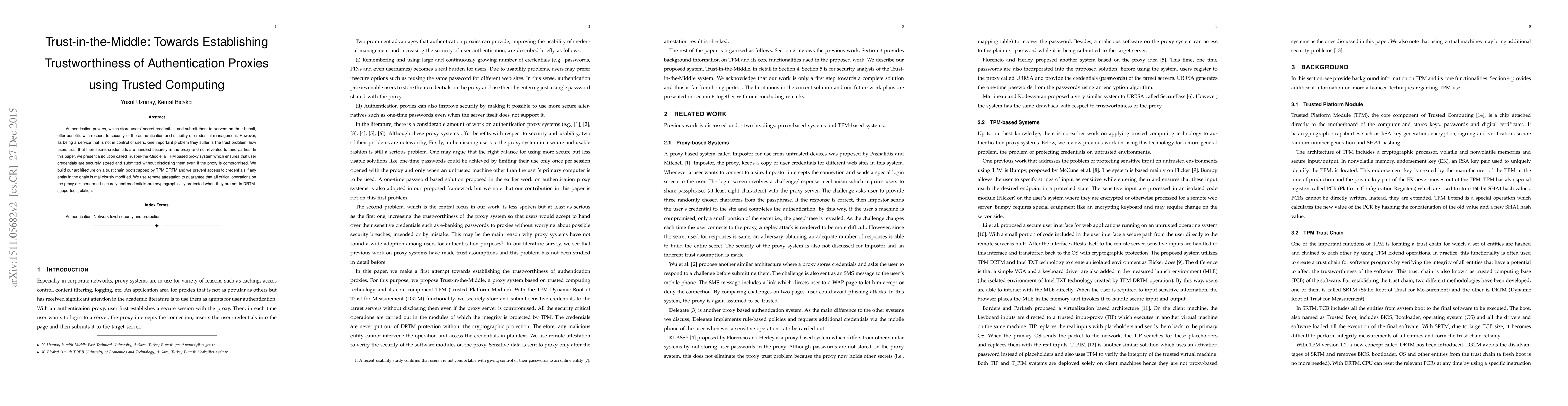 Title: Trust-in-the-Middle: Towards Establishing Trustworthiness of Authentication Proxies using Trusted Computing Summary: This paper proposes Trust-in-the-Middle, a Trusted Platform Module (TPM) based authentication proxy system that ensures secure storage and submission of user credentials, leveraging remote attestation and a trust chain to prevent unauthorized access even if the proxy is compromised.