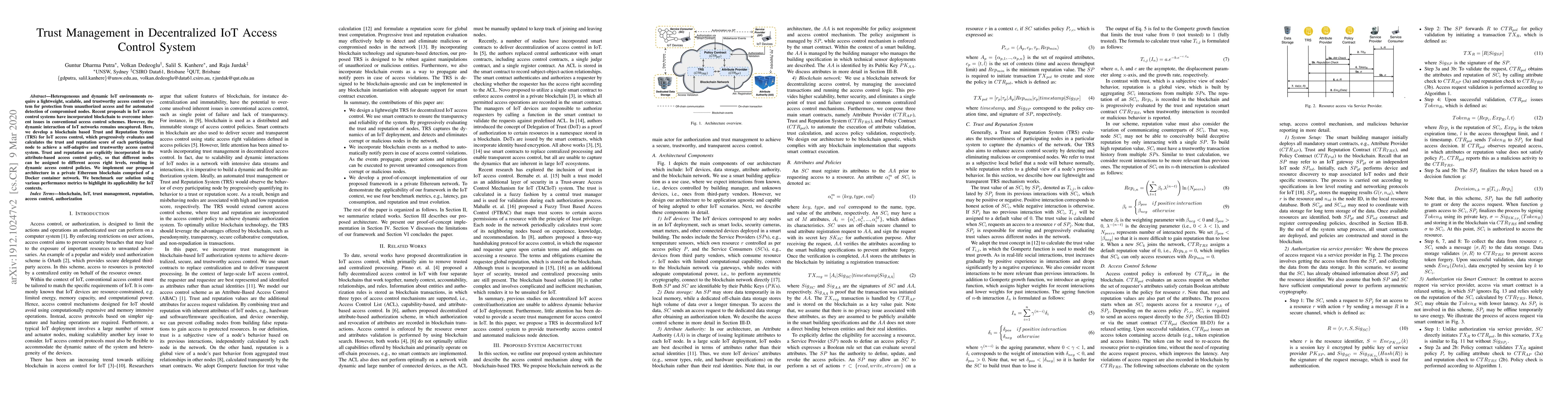 This paper proposes a blockchain-based Trust and Reputation System (TRS) for decentralized IoT access control, dynamically evaluating and calculating trust scores to create adaptive access control policies. The system is implemented on a private Ethereum blockchain and benchmarked for performance, demonstrating its effectiveness for IoT environments.