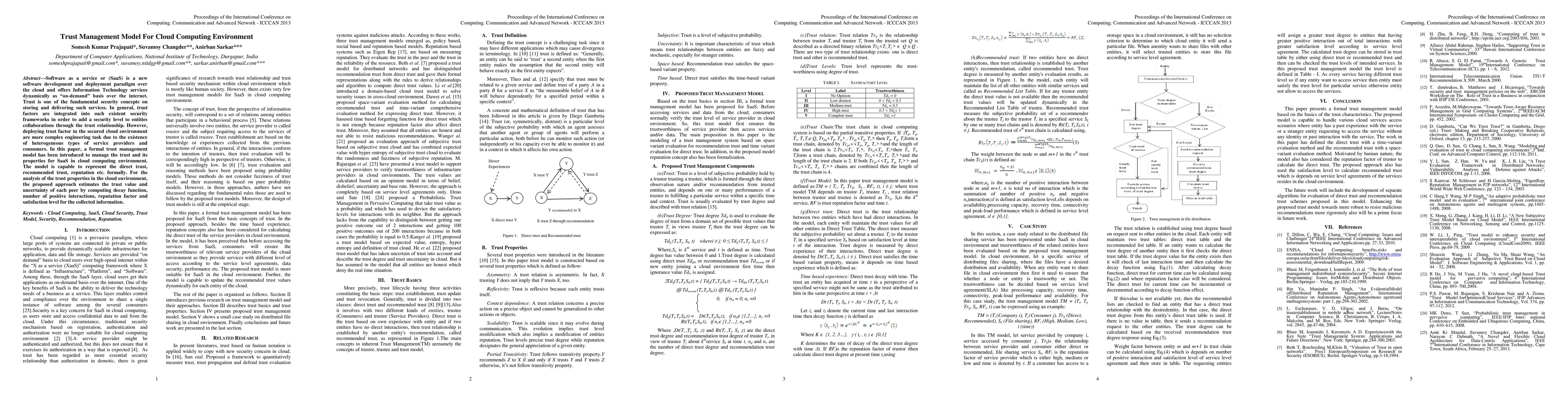 Software as a service or (SaaS) is a new software development and deployment paradigm over the cloud and offers Information Technology services dynamically as "on-demand" basis over the internet. Trust is one of the fundamental security concepts on storing and delivering such services. In general, trust factors are integrated into such existent security frameworks in order to add a security level to entities collaborations through the trust relationship. However, deploying trust factor in the secured cloud environment are more complex engineering task due to the existence of heterogeneous types of service providers and consumers. In this paper, a formal trust management model has been introduced to manage the trust and its properties for SaaS in cloud computing environment. The model is capable to represent the direct trust, recommended trust, reputation etc. formally. For the analysis of the trust properties in the cloud environment, the proposed approach estimates the trust value and uncertainty of each peer by computing decay function, number of positive interactions, reputation factor and satisfaction level for the collected information.