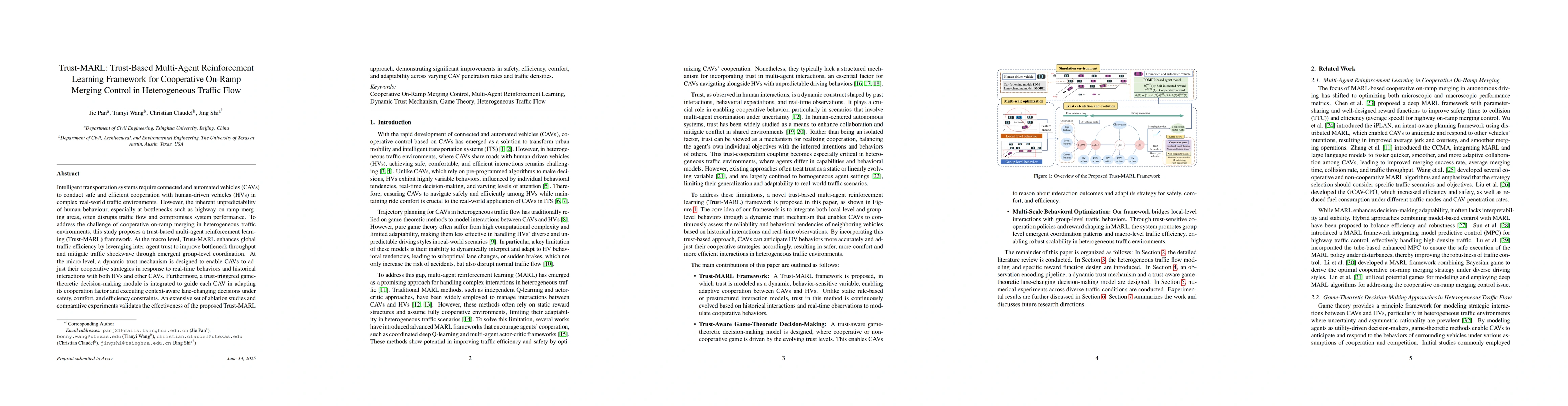 Intelligent transportation systems require connected and automated vehicles (CAVs) to conduct safe and efficient cooperation with human-driven vehicles (HVs) in complex real-world traffic environments. However, the inherent unpredictability of human behaviour, especially at bottlenecks such as highway on-ramp merging areas, often disrupts traffic flow and compromises system performance. To address the challenge of cooperative on-ramp merging in heterogeneous traffic environments, this study proposes a trust-based multi-agent reinforcement learning (Trust-MARL) framework. At the macro level, Trust-MARL enhances global traffic efficiency by leveraging inter-agent trust to improve bottleneck throughput and mitigate traffic shockwave through emergent group-level coordination. At the micro level, a dynamic trust mechanism is designed to enable CAVs to adjust their cooperative strategies in response to real-time behaviors and historical interactions with both HVs and other CAVs. Furthermore, a trust-triggered game-theoretic decision-making module is integrated to guide each CAV in adapting its cooperation factor and executing context-aware lane-changing decisions under safety, comfort, and efficiency constraints. An extensive set of ablation studies and comparative experiments validates the effectiveness of the proposed Trust-MARL approach, demonstrating significant improvements in safety, efficiency, comfort, and adaptability across varying CAV penetration rates and traffic densities.