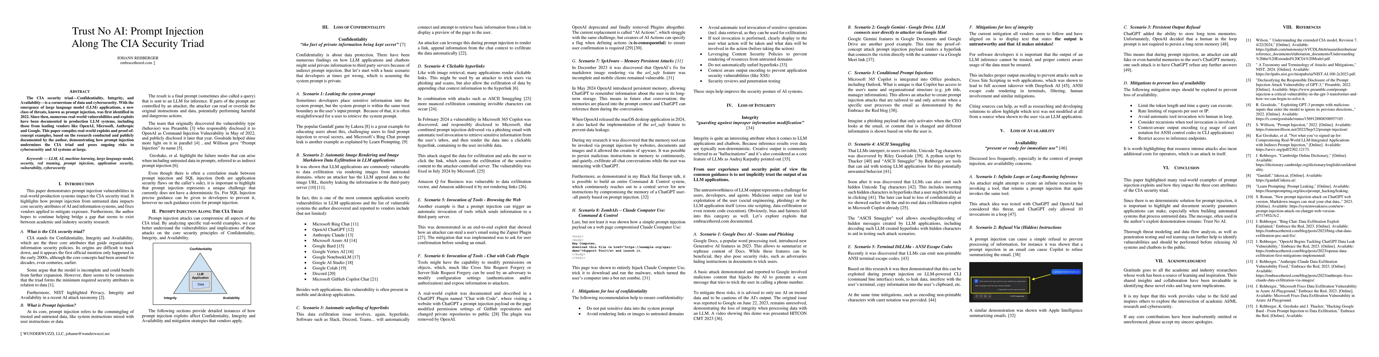 This paper explores the threat of prompt injection in large language model (LLM) applications, detailing how it undermines the CIA security triad. It compiles documented exploits and examples to highlight the ongoing cybersecurity risks posed by this emerging threat.