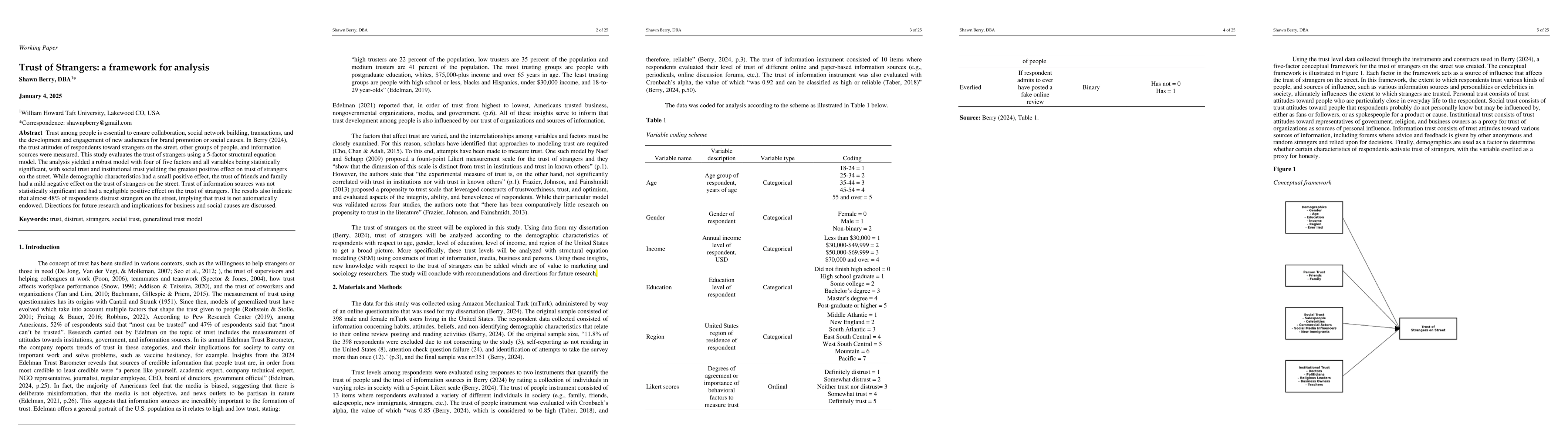 Berry (2024) employs a 5-factor structural equation model to analyze trust attitudes towards strangers, finding social and institutional trust to significantly bolster street-level trust, while trust in friends and family mildly detracts. Almost half of respondents distrust strangers, highlighting the non-automatic nature of such trust.