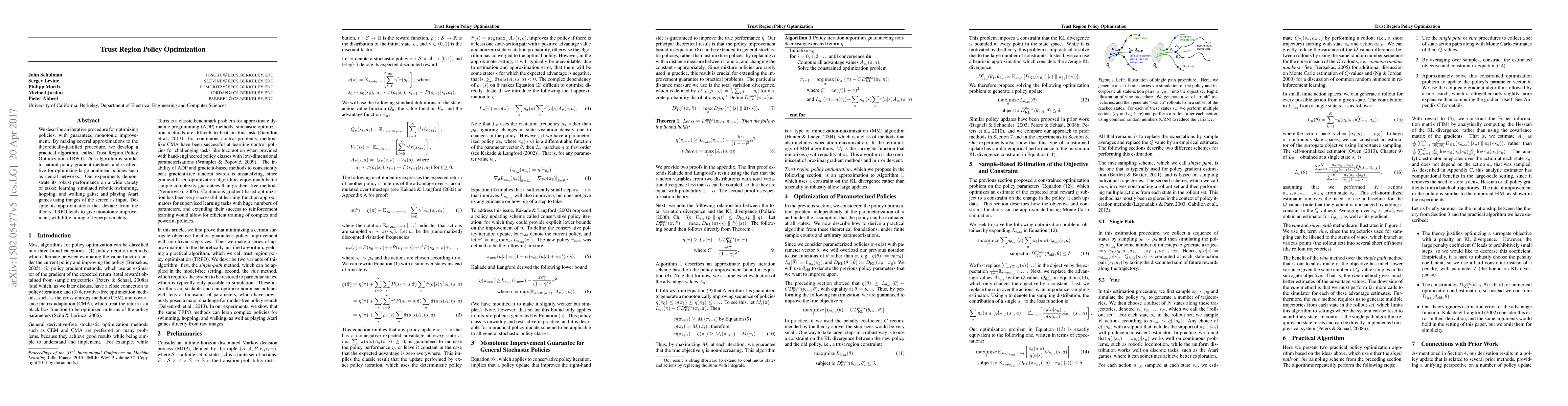 We describe an iterative procedure for optimizing policies, with guaranteed monotonic improvement. By making several approximations to the theoretically-justified procedure, we develop a practical algorithm, called Trust Region Policy Optimization (TRPO). This algorithm is similar to natural policy gradient methods and is effective for optimizing large nonlinear policies such as neural networks. Our experiments demonstrate its robust performance on a wide variety of tasks: learning simulated robotic swimming, hopping, and walking gaits; and playing Atari games using images of the screen as input. Despite its approximations that deviate from the theory, TRPO tends to give monotonic improvement, with little tuning of hyperparameters.