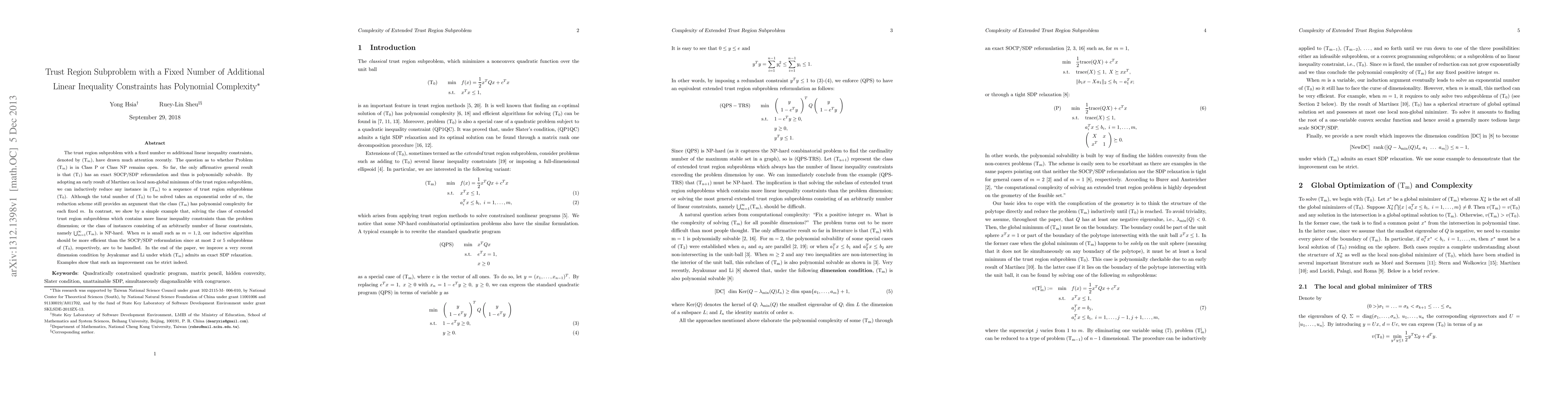 This paper demonstrates that the trust region subproblem with a fixed number of additional linear inequality constraints (Tm) has polynomial complexity for each fixed m. It shows an inductive reduction to simpler subproblems (T0), despite the exponential growth in the number of these subproblems, and argues that the overall complexity remains polynomial. However, it also proves that extended trust region subproblems with more constraints than dimensions or with an arbitrary number of constraints are NP-hard.
