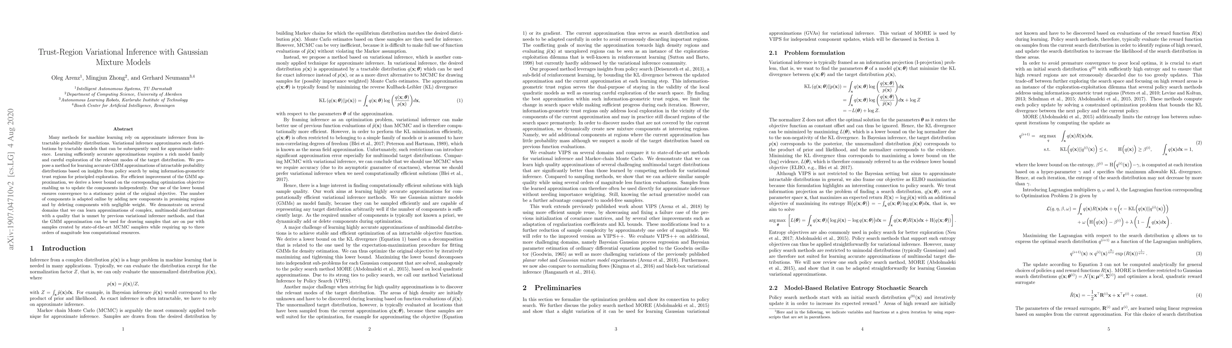 Many methods for machine learning rely on approximate inference from intractable probability distributions. Variational inference approximates such distributions by tractable models that can be subsequently used for approximate inference. Learning sufficiently accurate approximations requires a rich model family and careful exploration of the relevant modes of the target distribution. We propose a method for learning accurate GMM approximations of intractable probability distributions based on insights from policy search by using information-geometric trust regions for principled exploration. For efficient improvement of the GMM approximation, we derive a lower bound on the corresponding optimization objective enabling us to update the components independently. Our use of the lower bound ensures convergence to a stationary point of the original objective. The number of components is adapted online by adding new components in promising regions and by deleting components with negligible weight. We demonstrate on several domains that we can learn approximations of complex, multimodal distributions with a quality that is unmet by previous variational inference methods, and that the GMM approximation can be used for drawing samples that are on par with samples created by state-of-the-art MCMC samplers while requiring up to three orders of magnitude less computational resources.