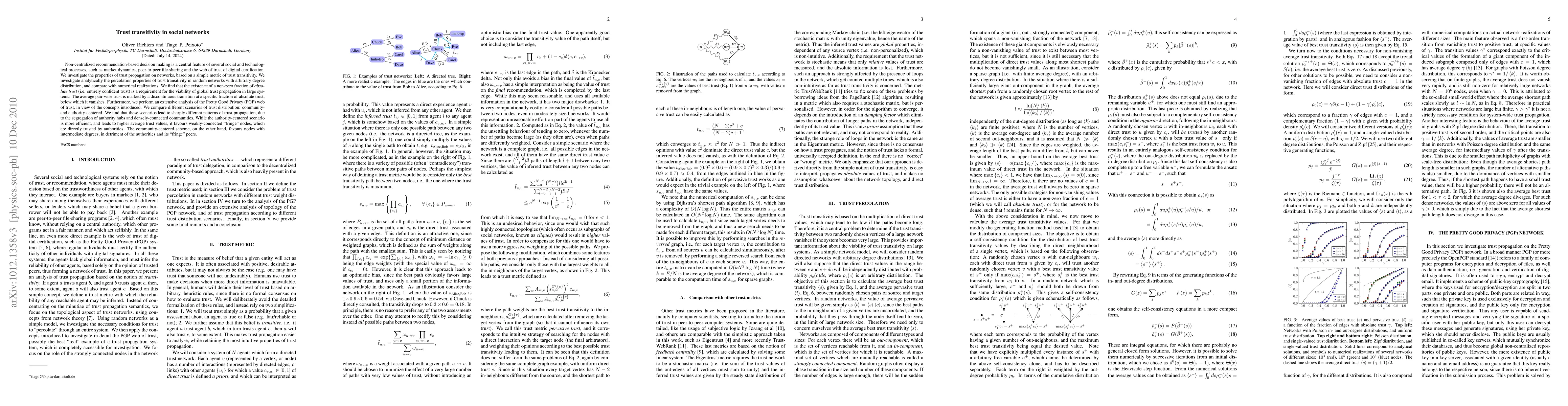 This paper examines trust transitivity in social networks, finding that global trust propagation requires a non-zero fraction of absolute trust. It analyzes trust percolation in random networks and compares results to the PGP web of trust, revealing distinct propagation patterns in community- and authority-centered trust distributions.