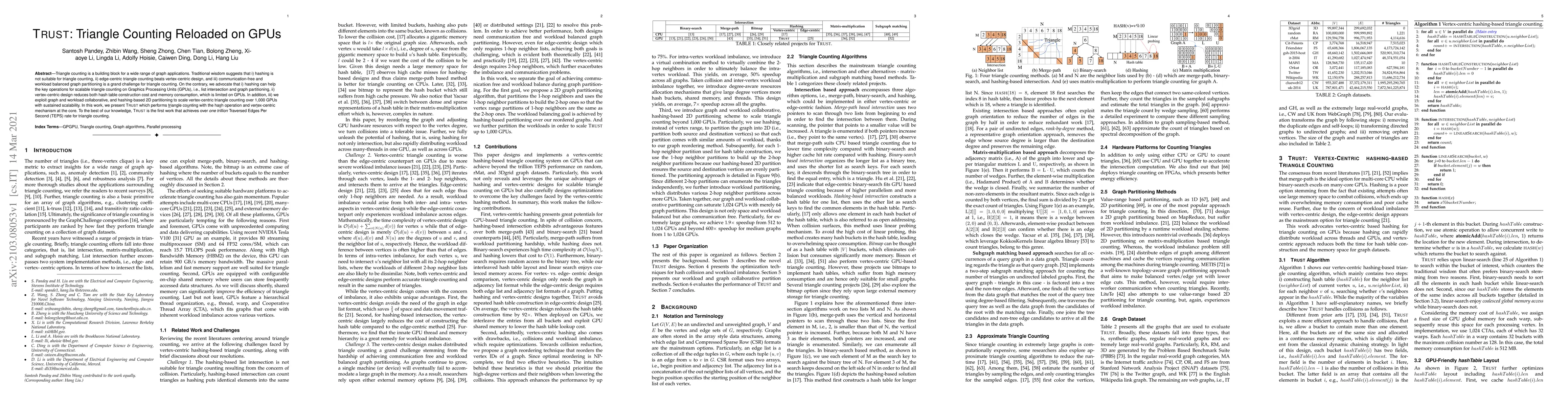 TRUST proposes a novel approach to triangle counting on GPUs using hashing and vertex-centric design to overcome traditional limitations. It achieves unprecedented scalability and performance, reaching over one trillion Traversed Edges Per Second (TEPS).
