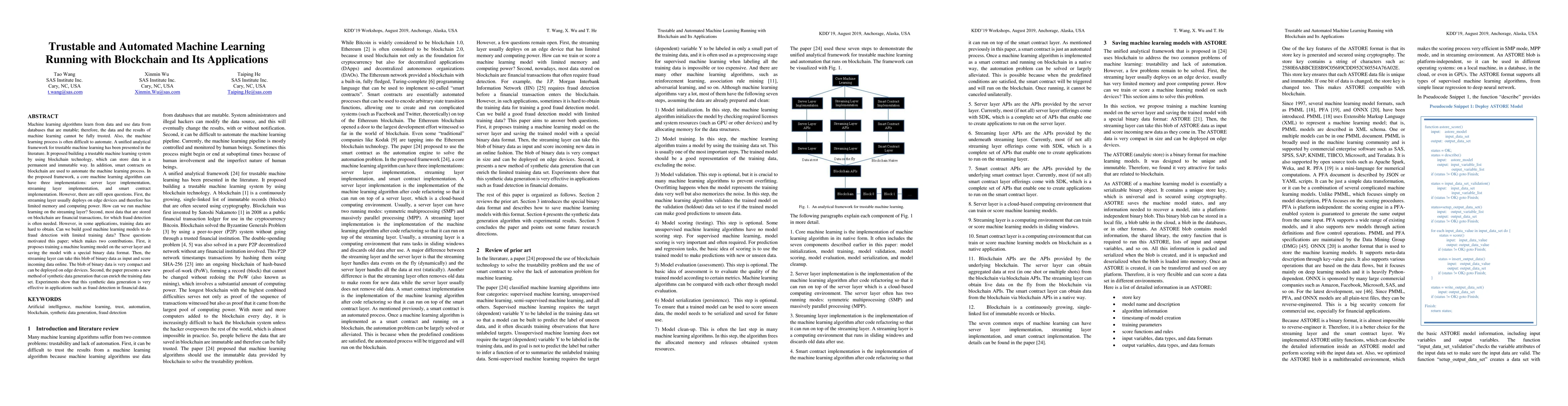 This paper proposes a framework for trustable machine learning using blockchain and smart contracts, addressing the challenges of running machine learning on edge devices and training models with limited data. It introduces a method for compact model deployment and a synthetic data generation technique to enhance fraud detection in financial applications.