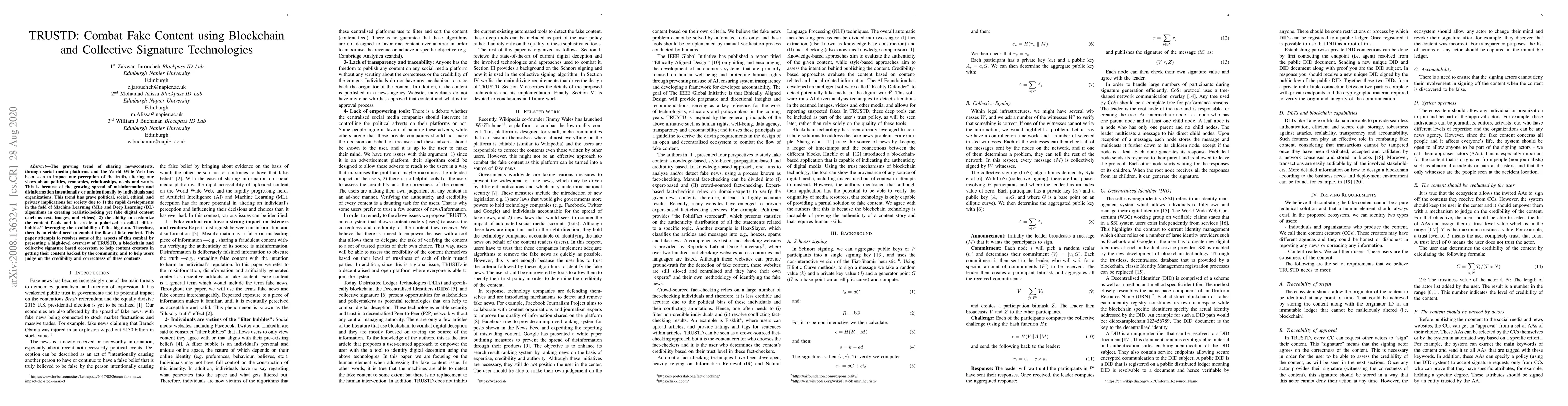 The growing trend of sharing news/contents, through social media platforms and the World Wide Web has been seen to impact our perception of the truth, altering our views about politics, economics, relationships, needs and wants. This is because of the growing spread of misinformation and disinformation intentionally or unintentionally by individuals and organizations. This trend has grave political, social, ethical, and privacy implications for society due to 1) the rapid developments in the field of Machine Learning (ML) and Deep Learning (DL) algorithms in creating realistic-looking yet fake digital content (such as text, images, and videos), 2) the ability to customize the content feeds and to create a polarized so-called "filter-bubbles" leveraging the availability of the big-data. Therefore, there is an ethical need to combat the flow of fake content. This paper attempts to resolve some of the aspects of this combat by presenting a high-level overview of TRUSTD, a blockchain and collective signature-based ecosystem to help content creators in getting their content backed by the community, and to help users judge on the credibility and correctness of these contents.