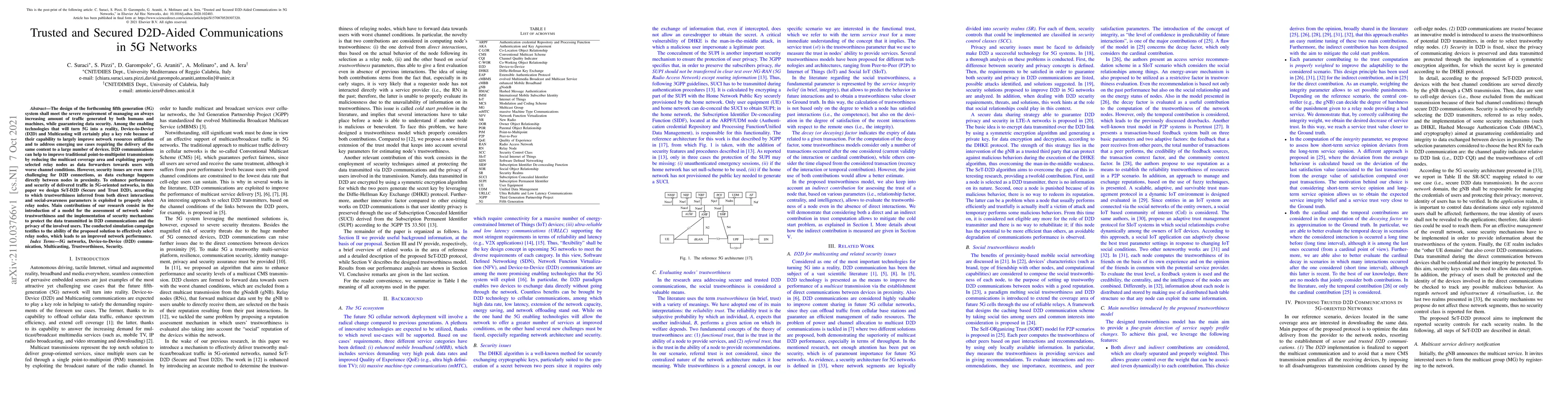 The design of the forthcoming fifth generation (5G) system shall meet the severe requirement of managing an always increasing amount of traffic generated by both humans and machines, while guaranteeing data security. Among the enabling technologies that will turn 5G into a reality, Device-to-Device (D2D) and Multicasting will certainly play a key role because of their capability to largely improve network resources utilization and to address emerging use cases requiring the delivery of the same content to a large number of devices. D2D communications can help to improve traditional point-to-multipoint transmissions by reducing the multicast coverage area and exploiting properly selected relay nodes as data forwarders towards users with worse channel conditions. However, security issues are even more challenging for D2D connections, as data exchange happens directly between nodes in proximity. To enhance performance and security of delivered traffic in 5G-oriented networks, in this paper we design SeT-D2D (Secure and Trust D2D), according to which trustworthiness inferred from both direct interactions and social-awareness parameters is exploited to properly select relay nodes. Main contributions of our research consist in the introduction of a model for the assessment of network nodes' trustworthiness and the implementation of security mechanisms to protect the data transmitted in D2D communications and the privacy of the involved users. The conducted simulation campaign testifies to the ability of the proposed solution to effectively select relay nodes, which leads to an improved network performance.