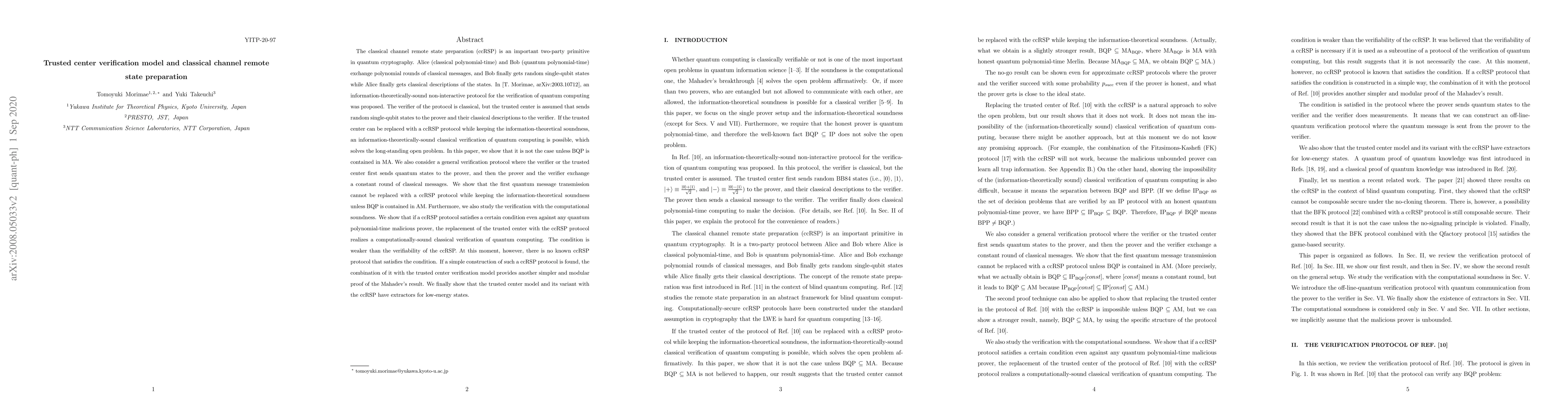 This paper investigates the feasibility of replacing a trusted center with a classical channel remote state preparation (ccRSP) protocol for verifying quantum computing. It concludes that such a replacement is not possible under current complexity assumptions unless BQP is contained in MA or AM, but a computationally-sound verification can be achieved if the ccRSP protocol satisfies certain conditions.