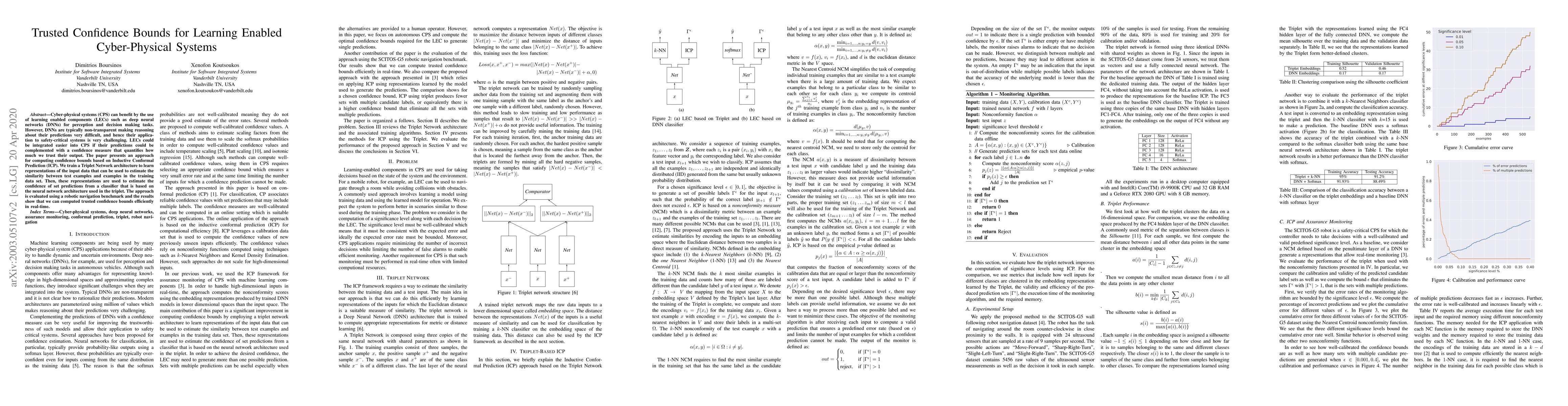 Cyber-physical systems (CPS) can benefit by the use of learning enabled components (LECs) such as deep neural networks (DNNs) for perception and decision making tasks. However, DNNs are typically non-transparent making reasoning about their predictions very difficult, and hence their application to safety-critical systems is very challenging. LECs could be integrated easier into CPS if their predictions could be complemented with a confidence measure that quantifies how much we trust their output. The paper presents an approach for computing confidence bounds based on Inductive Conformal Prediction (ICP). We train a Triplet Network architecture to learn representations of the input data that can be used to estimate the similarity between test examples and examples in the training data set. Then, these representations are used to estimate the confidence of set predictions from a classifier that is based on the neural network architecture used in the triplet. The approach is evaluated using a robotic navigation benchmark and the results show that we can computed trusted confidence bounds efficiently in real-time.