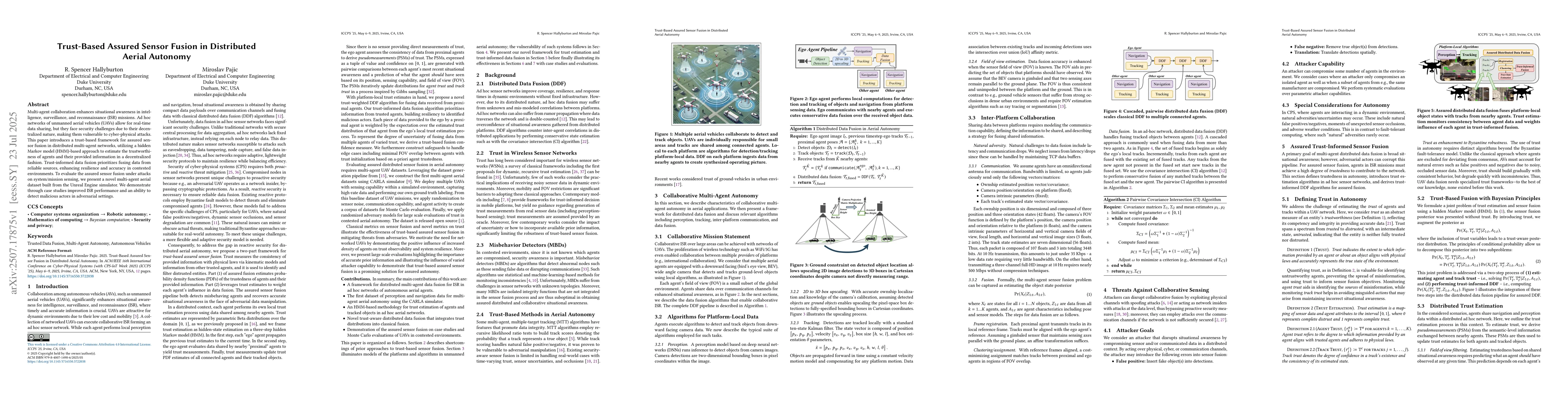 Multi-agent collaboration enhances situational awareness in intelligence, surveillance, and reconnaissance (ISR) missions. Ad hoc networks of unmanned aerial vehicles (UAVs) allow for real-time data sharing, but they face security challenges due to their decentralized nature, making them vulnerable to cyber-physical attacks. This paper introduces a trust-based framework for assured sensor fusion in distributed multi-agent networks, utilizing a hidden Markov model (HMM)-based approach to estimate the trustworthiness of agents and their provided information in a decentralized fashion. Trust-informed data fusion prioritizes fusing data from reliable sources, enhancing resilience and accuracy in contested environments. To evaluate the assured sensor fusion under attacks on system/mission sensing, we present a novel multi-agent aerial dataset built from the Unreal Engine simulator. We demonstrate through case studies improved ISR performance and an ability to detect malicious actors in adversarial settings.
