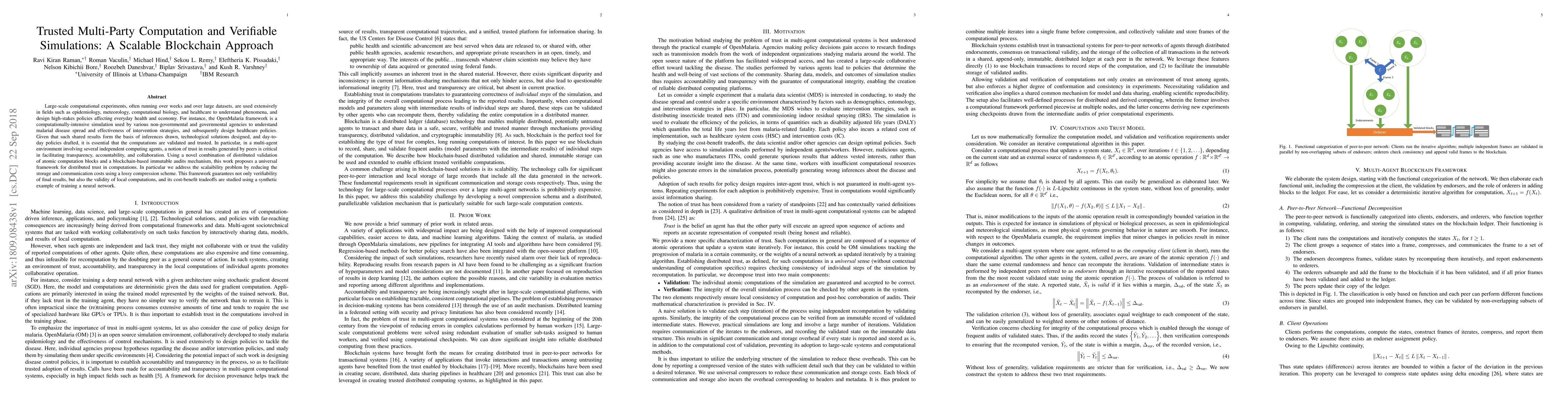 Large-scale computational experiments, often running over weeks and over large datasets, are used extensively in fields such as epidemiology, meteorology, computational biology, and healthcare to understand phenomena, and design high-stakes policies affecting everyday health and economy. For instance, the OpenMalaria framework is a computationally-intensive simulation used by various non-governmental and governmental agencies to understand malarial disease spread and effectiveness of intervention strategies, and subsequently design healthcare policies. Given that such shared results form the basis of inferences drawn, technological solutions designed, and day-to-day policies drafted, it is essential that the computations are validated and trusted. In particular, in a multi-agent environment involving several independent computing agents, a notion of trust in results generated by peers is critical in facilitating transparency, accountability, and collaboration. Using a novel combination of distributed validation of atomic computation blocks and a blockchain-based immutable audits mechanism, this work proposes a universal framework for distributed trust in computations. In particular we address the scalaibility problem by reducing the storage and communication costs using a lossy compression scheme. This framework guarantees not only verifiability of final results, but also the validity of local computations, and its cost-benefit tradeoffs are studied using a synthetic example of training a neural network.