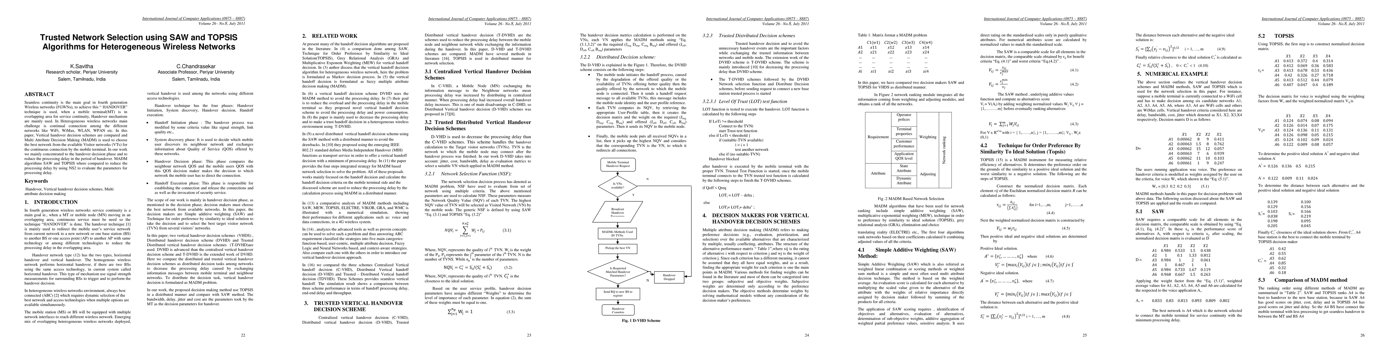 This paper compares Vertical Handover decision schemes in heterogeneous wireless networks using Multi Attribute Decision Making (MADM) algorithms SAW and TOPSIS to select the best network for seamless connectivity, aiming to reduce processing delays during handover. NS2 simulations evaluate the performance of these algorithms.
