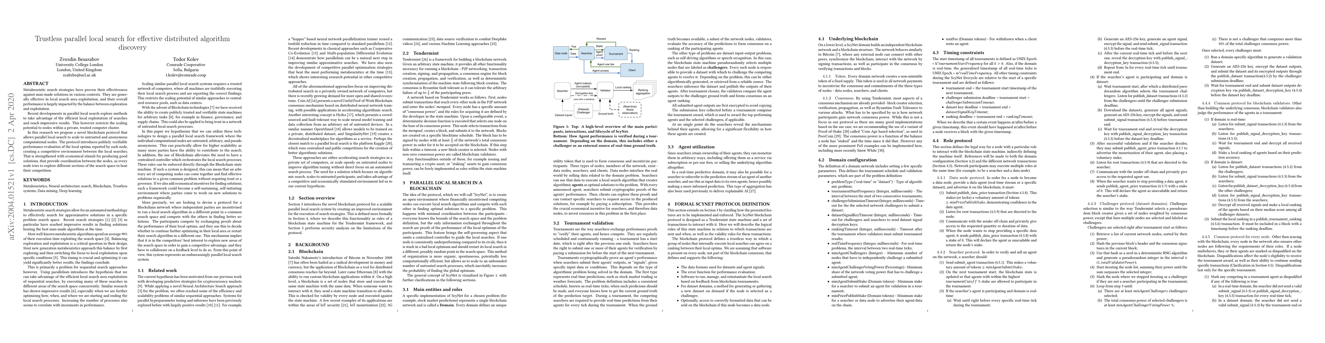 This paper proposes a blockchain protocol for trustless parallel local search, enabling distributed algorithm discovery across untrusted nodes. It introduces a competitive environment with economic incentives for nodes to explore different search space sections, ensuring effective scaling and coordination.