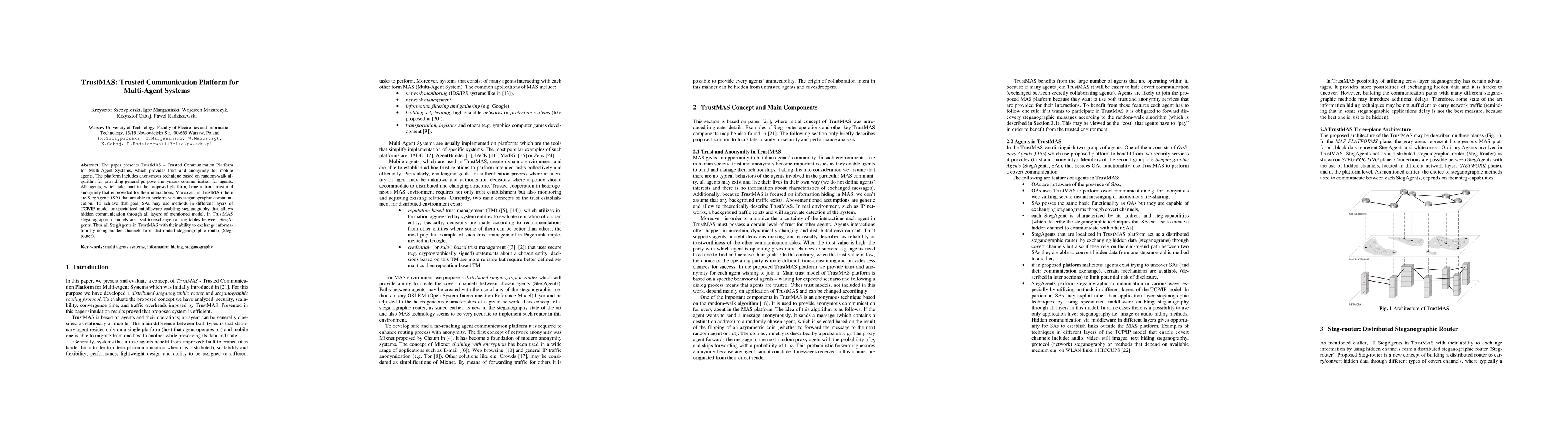 TrustMAS provides a trusted communication platform for multi-agent systems, enabling anonymous interactions and steganographic communication between agents.
