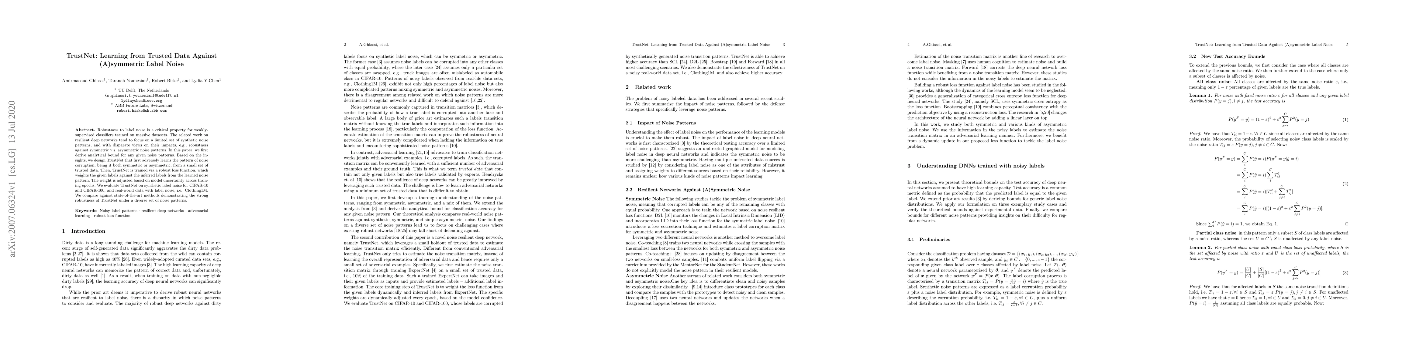 Robustness to label noise is a critical property for weakly-supervised classifiers trained on massive datasets. Robustness to label noise is a critical property for weakly-supervised classifiers trained on massive datasets. In this paper, we first derive analytical bound for any given noise patterns. Based on the insights, we design TrustNet that first adversely learns the pattern of noise corruption, being it both symmetric or asymmetric, from a small set of trusted data. Then, TrustNet is trained via a robust loss function, which weights the given labels against the inferred labels from the learned noise pattern. The weight is adjusted based on model uncertainty across training epochs. We evaluate TrustNet on synthetic label noise for CIFAR-10 and CIFAR-100, and real-world data with label noise, i.e., Clothing1M. We compare against state-of-the-art methods demonstrating the strong robustness of TrustNet under a diverse set of noise patterns.