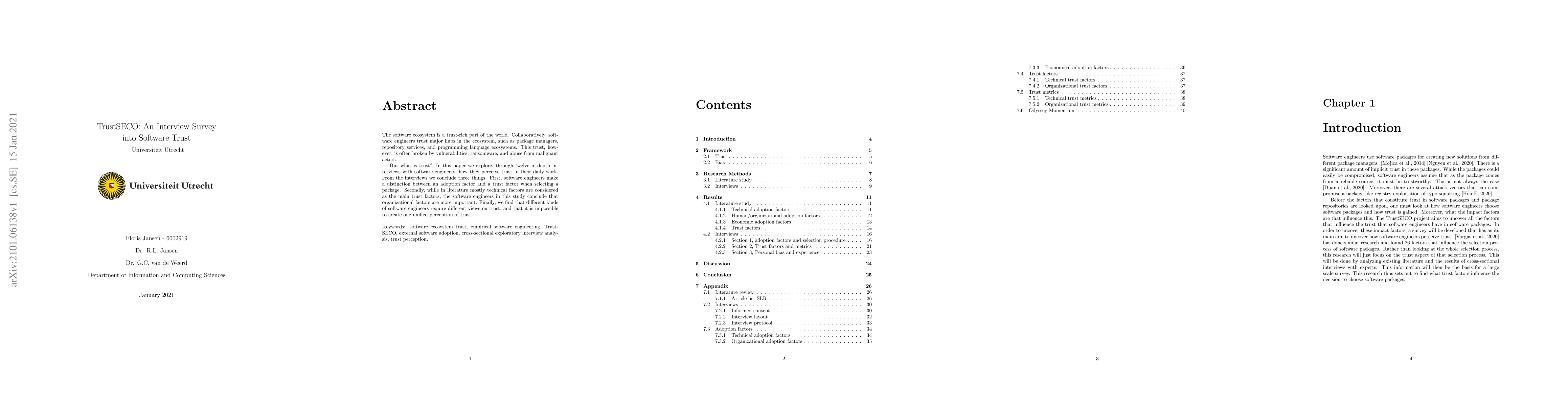 The software ecosystem is a trust-rich part of the world. Collaboratively, software engineers trust major hubs in the ecosystem, such as package managers, repository services, and programming language ecosystems. This trust, however, is often broken by vulnerabilities, ransomware, and abuse from malignant actors. But what is trust? In this paper we explore, through twelve in-depth interviews with software engineers, how they perceive trust in their daily work. From the interviews we conclude three things. First, software engineers make a distinction between an adoption factor and a trust factor when selecting a package. Secondly, while in literature mostly technical factors are considered as the main trust factors, the software engineers in this study conclude that organizational factors are more important. Finally, we find that different kinds of software engineers require different views on trust, and that it is impossible to create one unified perception of trust. Keywords: software ecosystem trust, empirical software engineering, TrustSECO, external software adoption, cross-sectional exploratory interview analysis, trust perception.