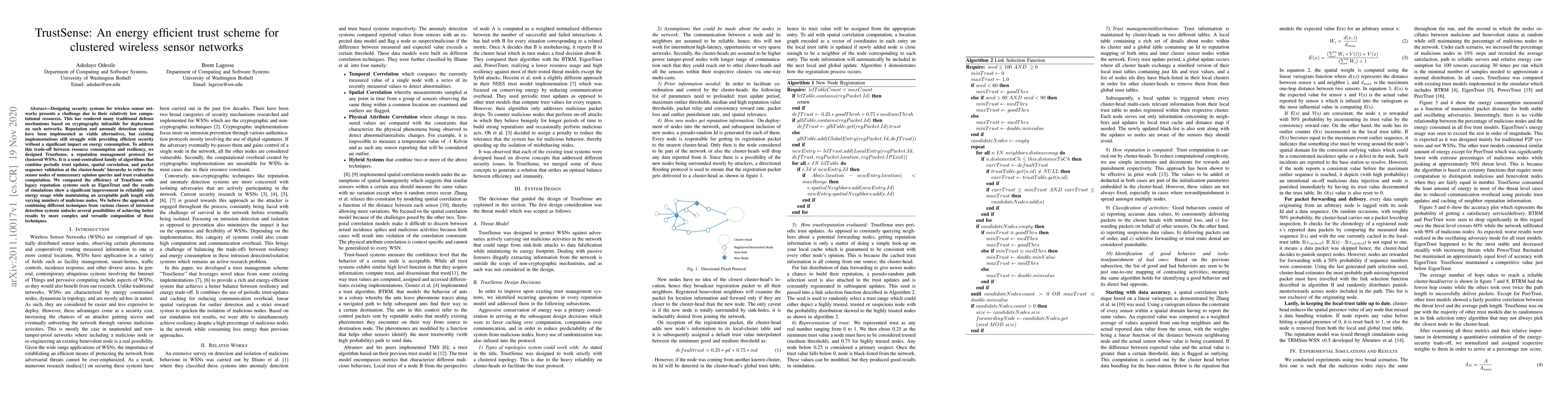 TrustSense is a novel energy-efficient trust management protocol for clustered wireless sensor networks, combining reputation updates, spatial correlation, and packet sequence validation to reduce computational load. Simulation results demonstrate improved reliability and lower energy consumption compared to legacy systems like EigenTrust.