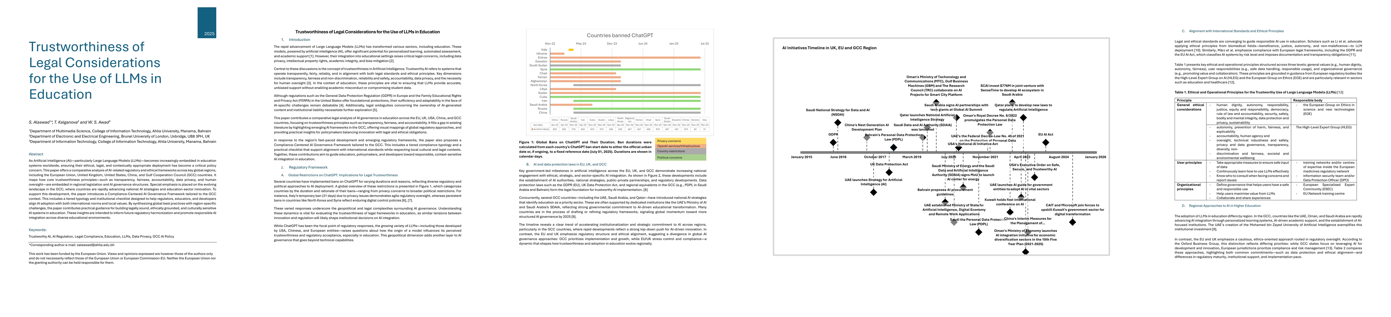 As Artificial Intelligence (AI), particularly Large Language Models (LLMs), becomes increasingly embedded in education systems worldwide, ensuring their ethical, legal, and contextually appropriate deployment has become a critical policy concern. This paper offers a comparative analysis of AI-related regulatory and ethical frameworks across key global regions, including the European Union, United Kingdom, United States, China, and Gulf Cooperation Council (GCC) countries. It maps how core trustworthiness principles, such as transparency, fairness, accountability, data privacy, and human oversight are embedded in regional legislation and AI governance structures. Special emphasis is placed on the evolving landscape in the GCC, where countries are rapidly advancing national AI strategies and education-sector innovation. To support this development, the paper introduces a Compliance-Centered AI Governance Framework tailored to the GCC context. This includes a tiered typology and institutional checklist designed to help regulators, educators, and developers align AI adoption with both international norms and local values. By synthesizing global best practices with region-specific challenges, the paper contributes practical guidance for building legally sound, ethically grounded, and culturally sensitive AI systems in education. These insights are intended to inform future regulatory harmonization and promote responsible AI integration across diverse educational environments.