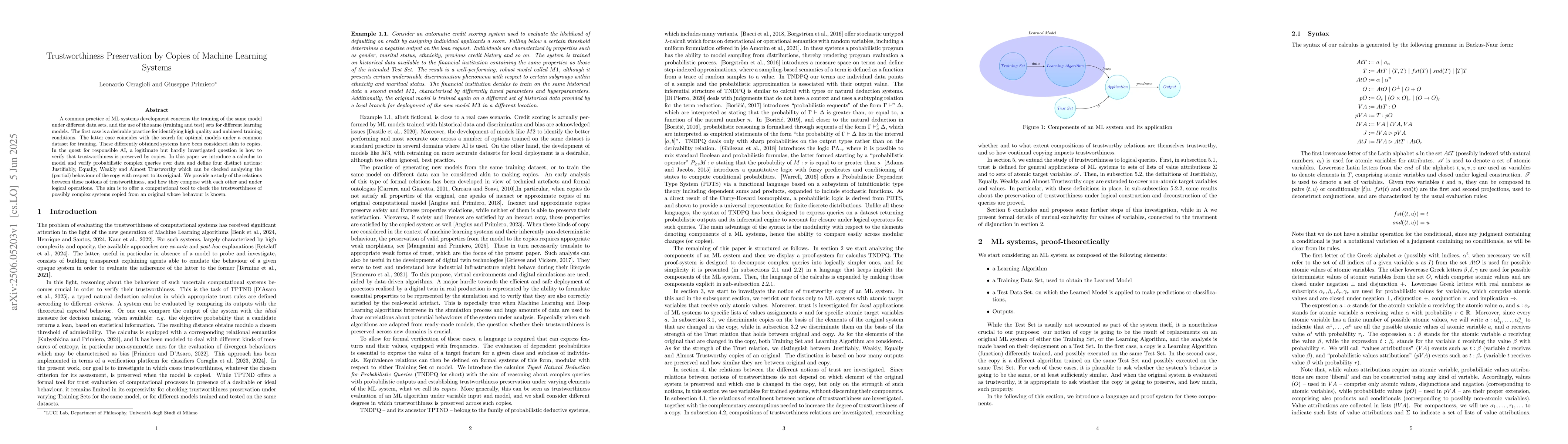 A common practice of ML systems development concerns the training of the same model under different data sets, and the use of the same (training and test) sets for different learning models. The first case is a desirable practice for identifying high quality and unbiased training conditions. The latter case coincides with the search for optimal models under a common dataset for training. These differently obtained systems have been considered akin to copies. In the quest for responsible AI, a legitimate but hardly investigated question is how to verify that trustworthiness is preserved by copies. In this paper we introduce a calculus to model and verify probabilistic complex queries over data and define four distinct notions: Justifiably, Equally, Weakly and Almost Trustworthy which can be checked analysing the (partial) behaviour of the copy with respect to its original. We provide a study of the relations between these notions of trustworthiness, and how they compose with each other and under logical operations. The aim is to offer a computational tool to check the trustworthiness of possibly complex systems copied from an original whose behavour is known.