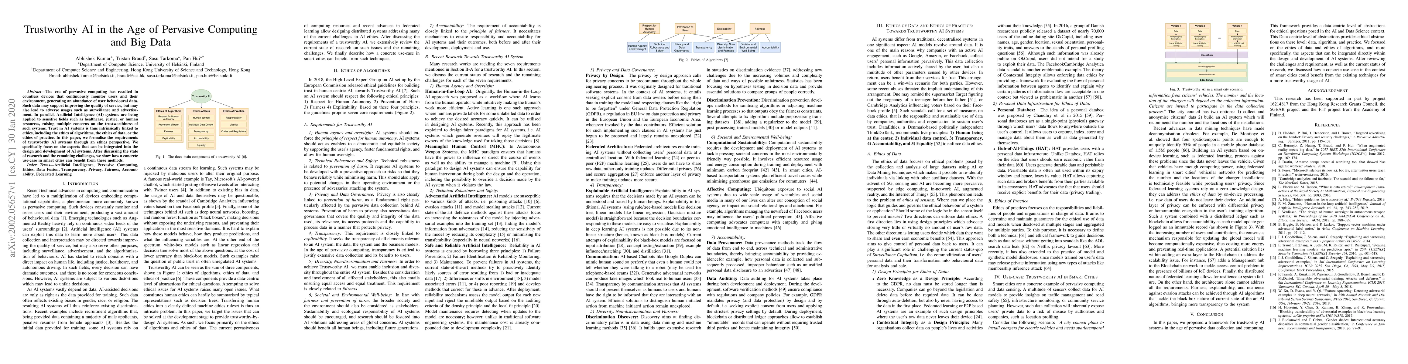 The era of pervasive computing has resulted in countless devices that continuously monitor users and their environment, generating an abundance of user behavioural data. Such data may support improving the quality of service, but may also lead to adverse usages such as surveillance and advertisement. In parallel, Artificial Intelligence (AI) systems are being applied to sensitive fields such as healthcare, justice, or human resources, raising multiple concerns on the trustworthiness of such systems. Trust in AI systems is thus intrinsically linked to ethics, including the ethics of algorithms, the ethics of data, or the ethics of practice. In this paper, we formalise the requirements of trustworthy AI systems through an ethics perspective. We specifically focus on the aspects that can be integrated into the design and development of AI systems. After discussing the state of research and the remaining challenges, we show how a concrete use-case in smart cities can benefit from these methods.