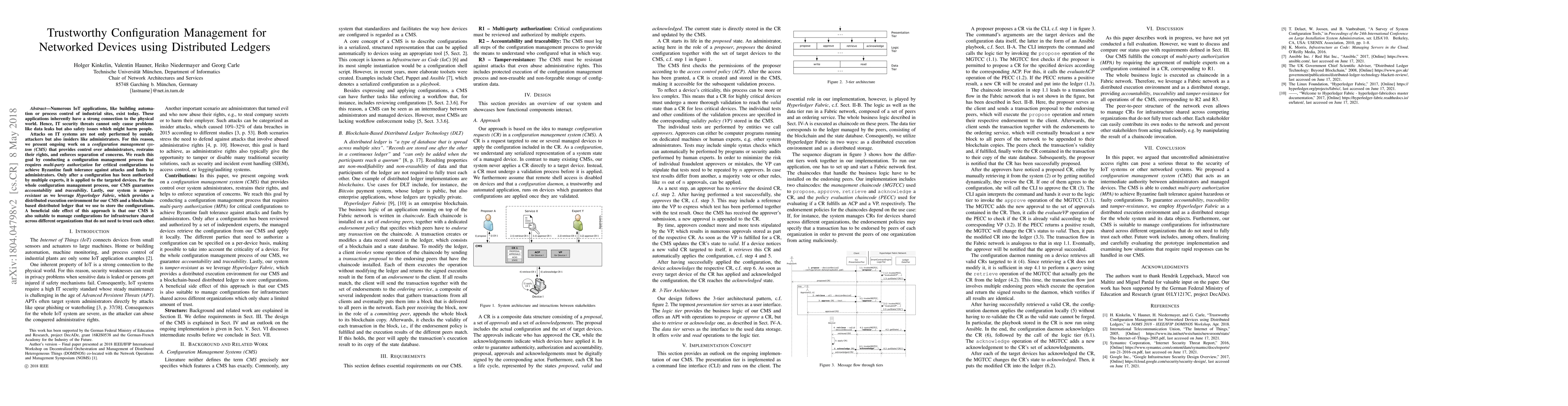 Numerous IoT applications, like building automation or process control of industrial sites, exist today. These applications inherently have a strong connection to the physical world. Hence, IT security threats cannot only cause problems like data leaks but also safety issues which might harm people. Attacks on IT systems are not only performed by outside attackers but also insiders like administrators. For this reason, we present ongoing work on a configuration management system (CMS) that provides control over administrators, restrains their rights, and enforces separation of concerns. We reach this goal by conducting a configuration management process that requires multi-party authorization for critical configurations to achieve Byzantine fault tolerance against attacks and faults by administrators. Only after a configuration has been authorized by multiple experts, it is applied to the targeted devices. For the whole configuration management process, our CMS guarantees accountability and traceability. Lastly, our system is tamper-resistant as we leverage Hyperledger Fabric, which provides a distributed execution environment for our CMS and a blockchain-based distributed ledger that we use to store the configurations. A beneficial side effect of this approach is that our CMS is also suitable to manage configurations for infrastructure shared across different organizations that do not need to trust each other.