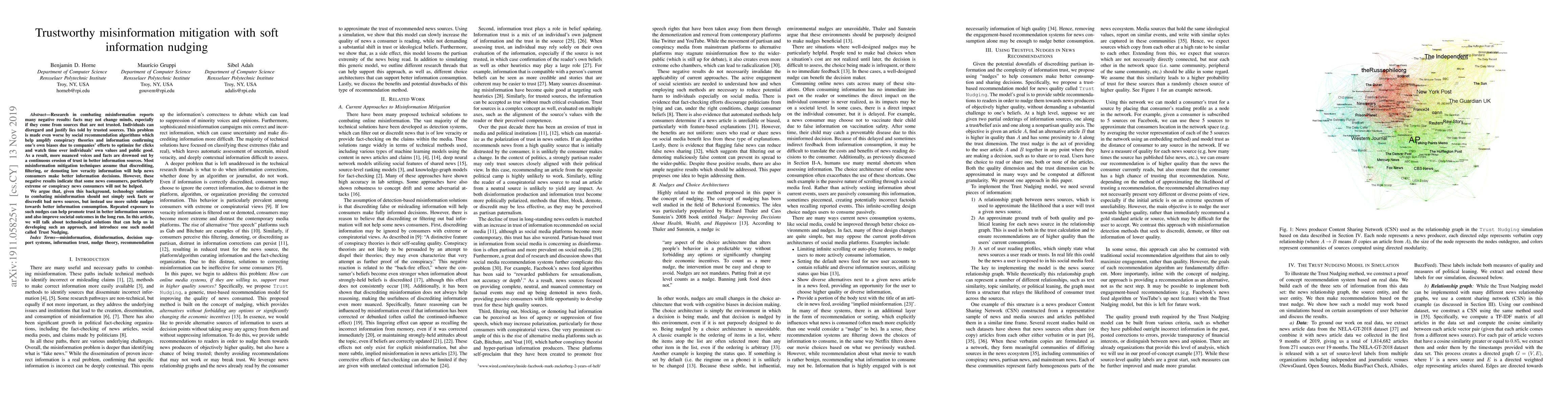 This paper discusses the limitations of traditional misinformation mitigation techniques and proposes a novel approach using "soft information nudging" to promote trust in credible sources. It introduces the Trust Nudging model as a technological solution to subtly guide news consumers towards better information consumption.