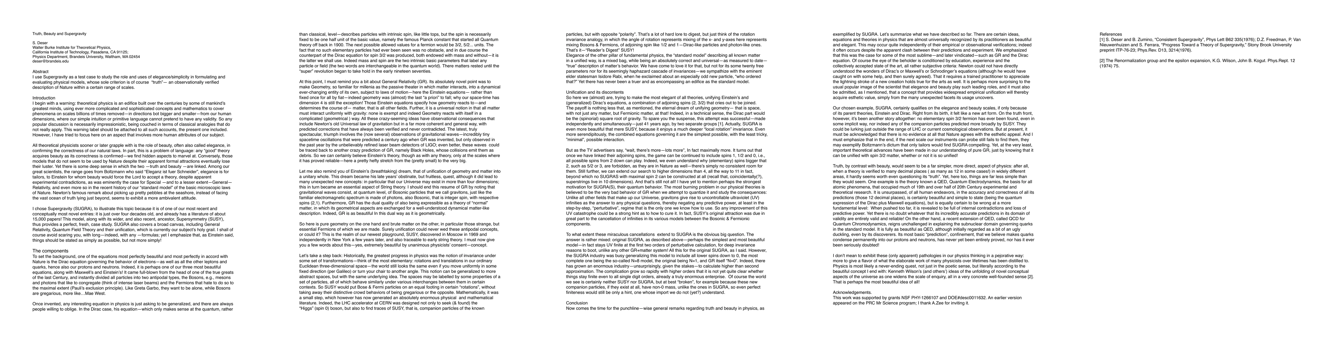 I use Supergravity as a test case to study the role and uses of elegance/simplicity in formulating and evaluating physical models, whose sole criterion is of course truth: an observationally verified description of Nature within a certain range of scales.