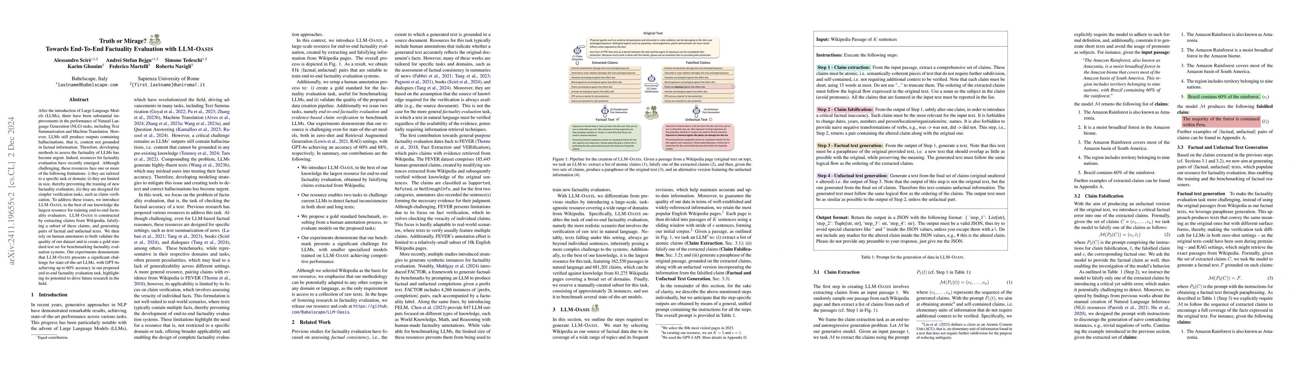After the introduction of Large Language Models (LLMs), there have been substantial improvements in the performance of Natural Language Generation (NLG) tasks, including Text Summarization and Machine Translation. However, LLMs still produce outputs containing hallucinations, that is, content not grounded in factual information. Therefore, developing methods to assess the factuality of LLMs has become urgent. Indeed, resources for factuality evaluation have recently emerged. Although challenging, these resources face one or more of the following limitations: (i) they are tailored to a specific task or domain; (ii) they are limited in size, thereby preventing the training of new factuality evaluators; (iii) they are designed for simpler verification tasks, such as claim verification. To address these issues, we introduce LLM-Oasis, to the best of our knowledge the largest resource for training end-to-end factuality evaluators. LLM-Oasis is constructed by extracting claims from Wikipedia, falsifying a subset of these claims, and generating pairs of factual and unfactual texts. We then rely on human annotators to both validate the quality of our dataset and to create a gold standard test set for benchmarking factuality evaluation systems. Our experiments demonstrate that LLM-Oasis presents a significant challenge for state-of-the-art LLMs, with GPT-4o achieving up to 60% accuracy in our proposed end-to-end factuality evaluation task, highlighting its potential to drive future research in the field.