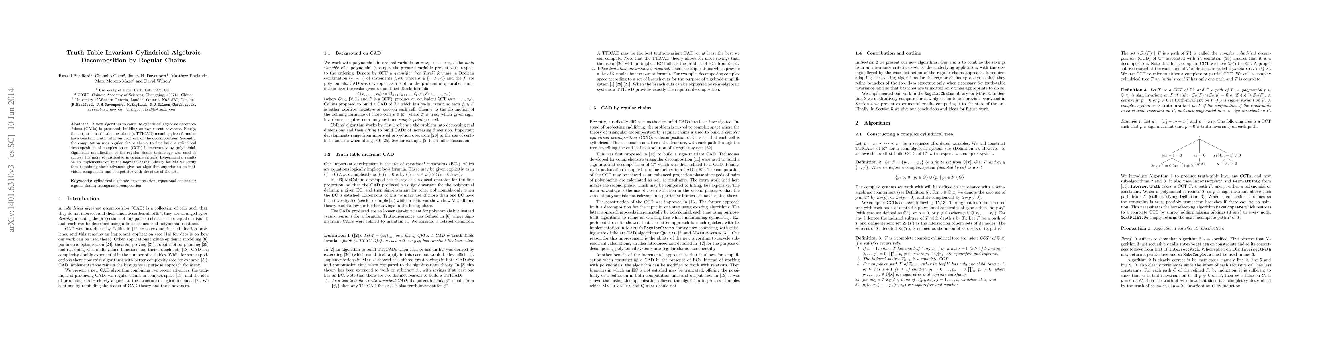 This paper introduces a new algorithm for cylindrical algebraic decompositions (CADs) that produces truth table invariant CADs (TTICADs) and leverages regular chains theory for efficient computation. The method incrementally builds a cylindrical decomposition of complex space, showing superior performance in experiments compared to existing methods.